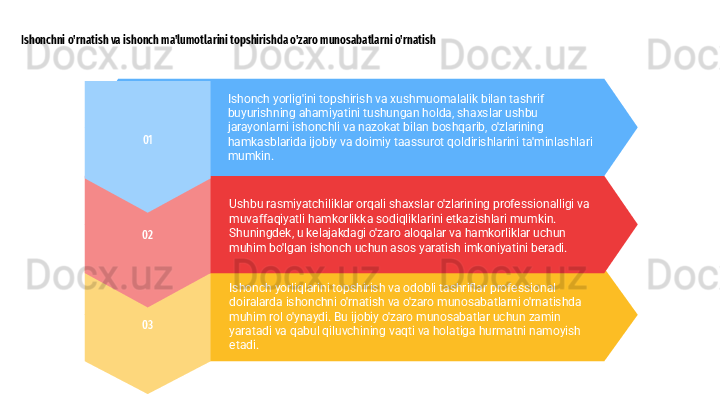 darajada oshirishi mumkin. 03 Ishonch yorliqlarini topshirish va odobli tashriflar professional