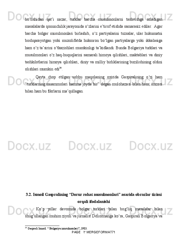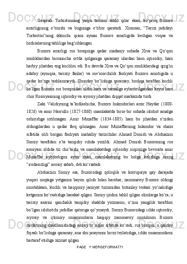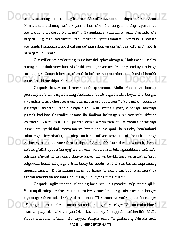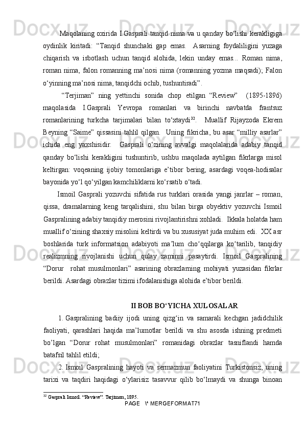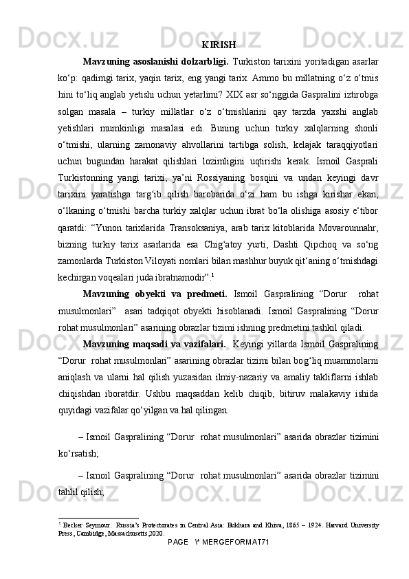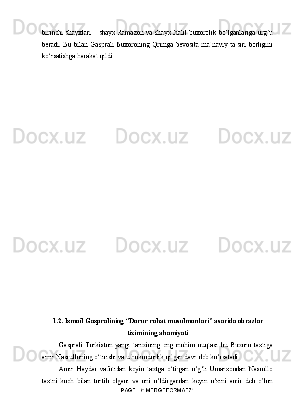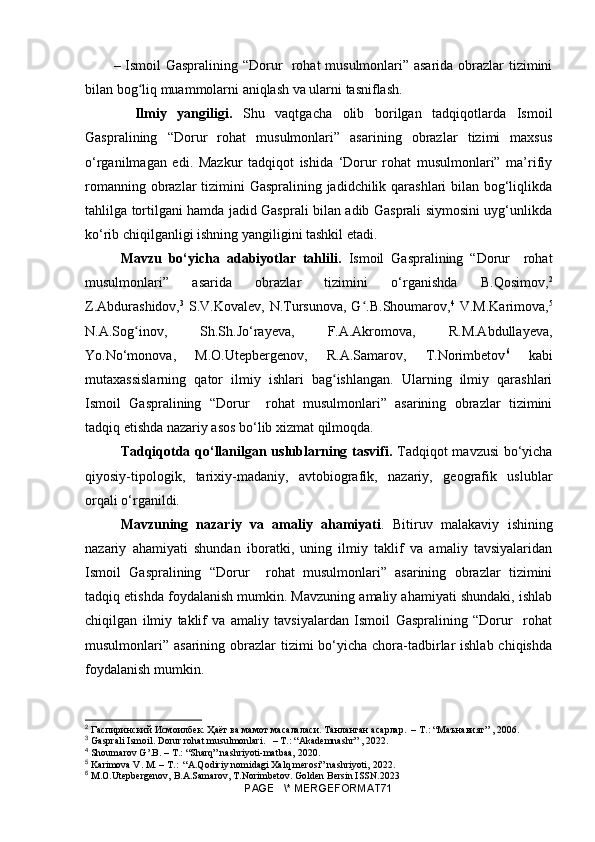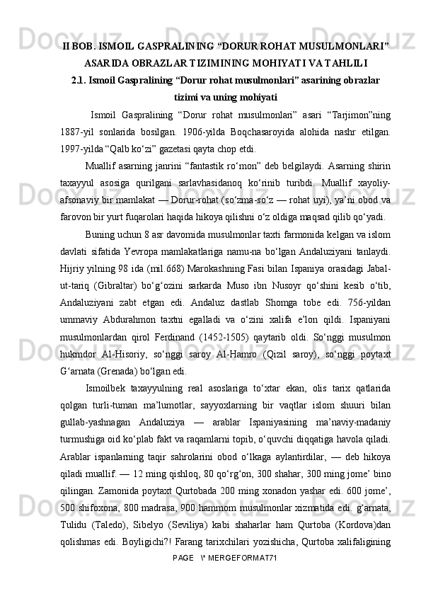 I. BOB. ISMOIL GASPRALINING HAYOTI, IJODI VA “DORUR ROHAT MUSULMONLARI” ASARIDA OBRAZLAR TIZIMINING AHAMIYATI………………………….…………………………………….….....6