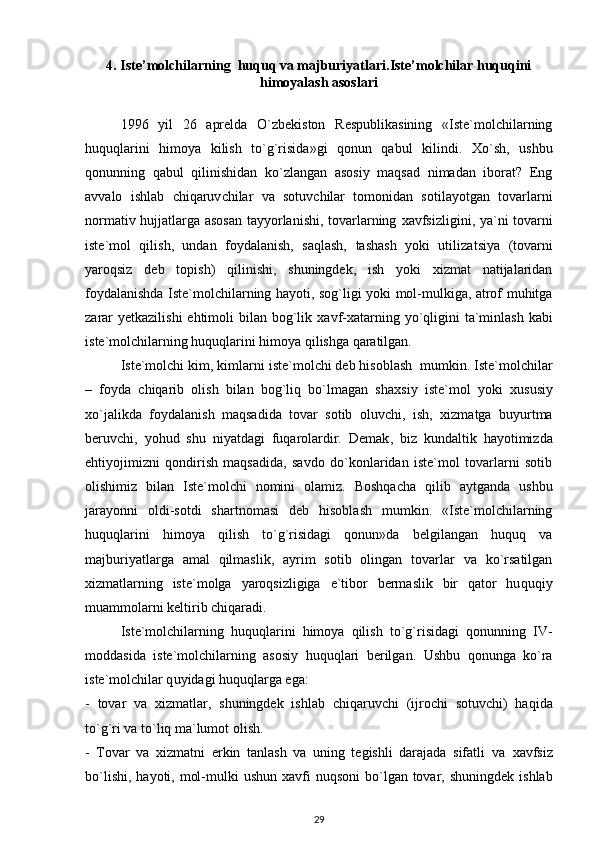 4. Iste’molchilarning huquq va majburiyatlari.Iste’molchilar huquqini himoyalash asoslari 28
