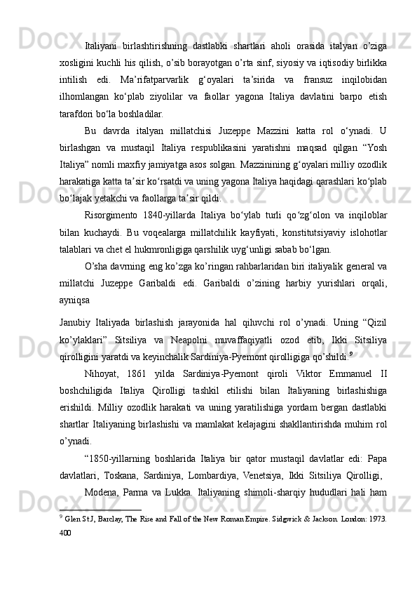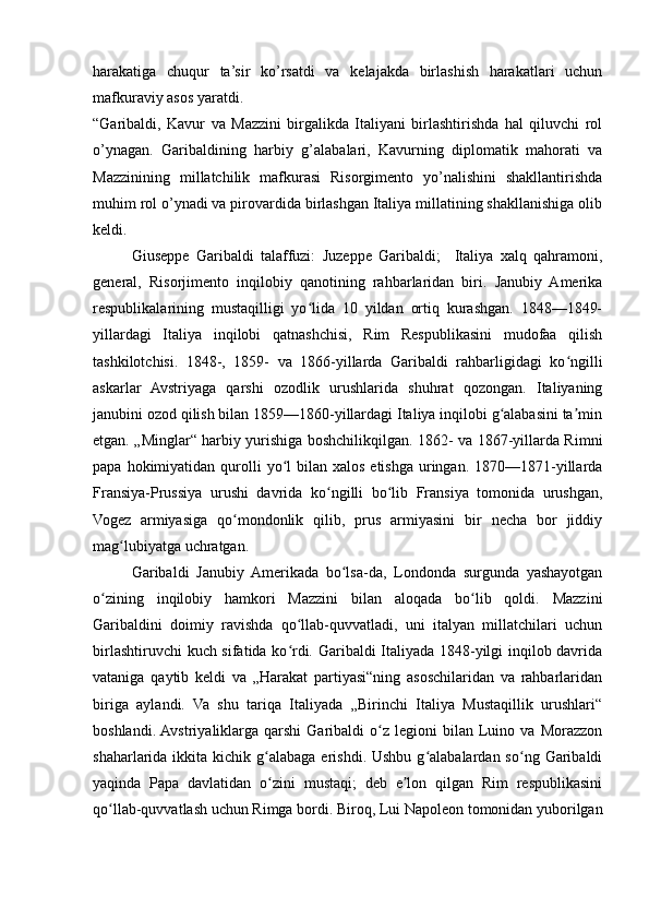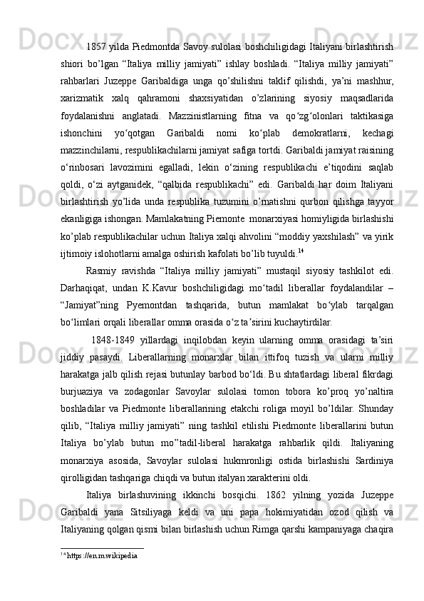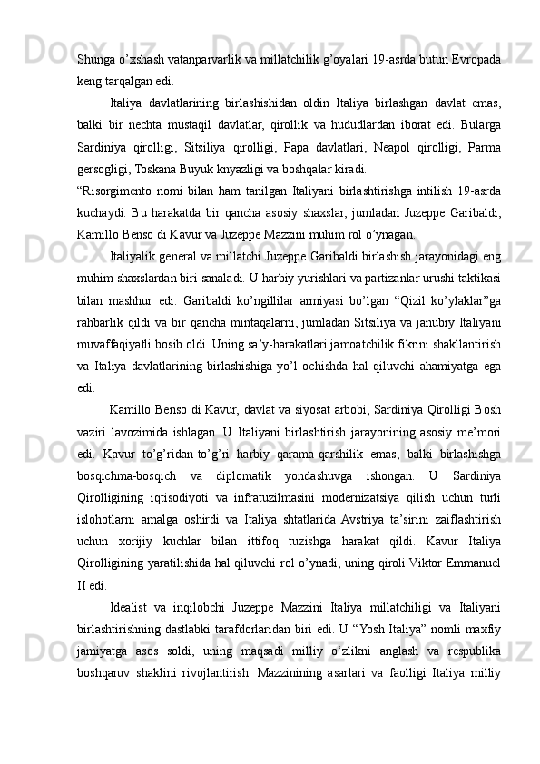 1.1. Italiya davlatlarining birlashishidan oldingi tarixiy vaziyat. Juzeppe Garibaldi, Kamillo Benso di Kavur va Juzeppe Mazzini kabi asosiy shaxslarning roli va ularning siyosati ........................................................................................................5