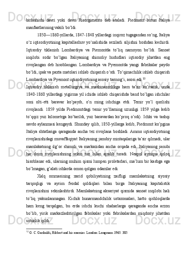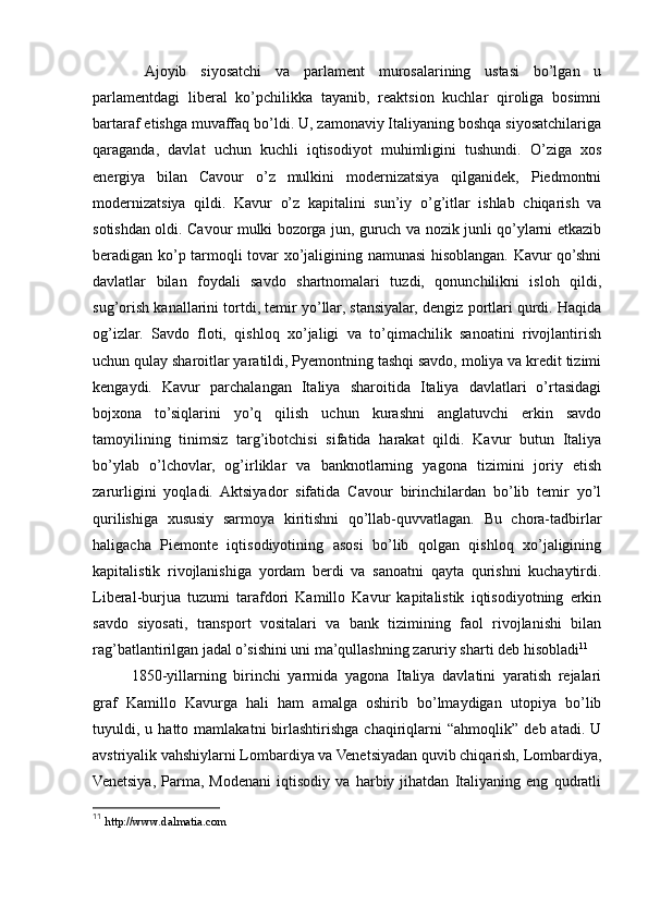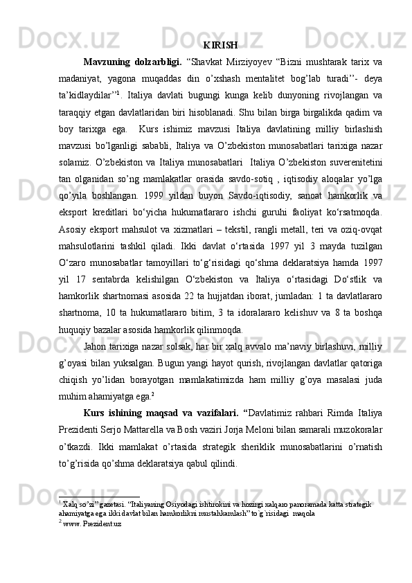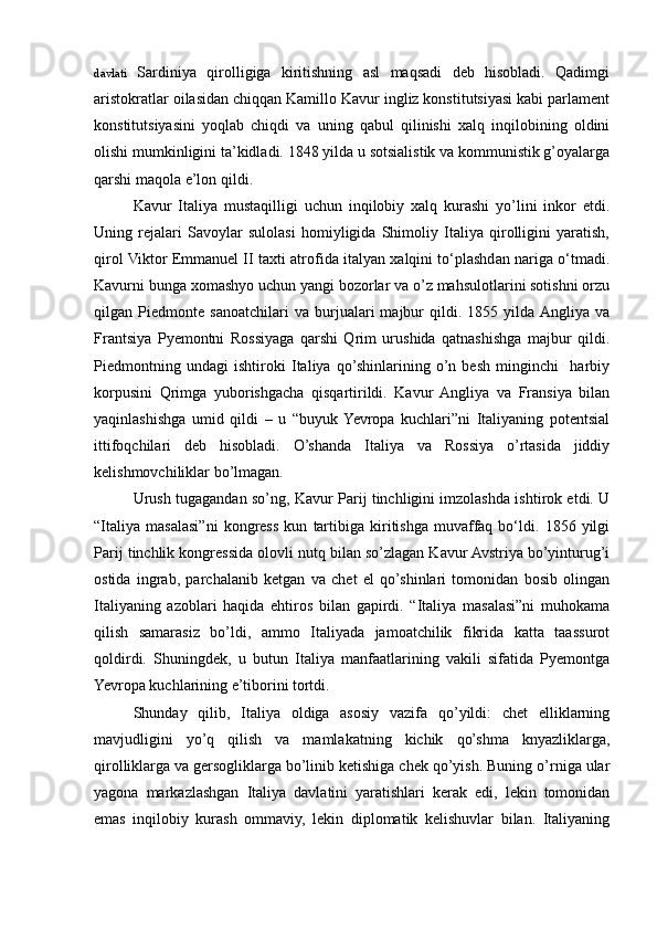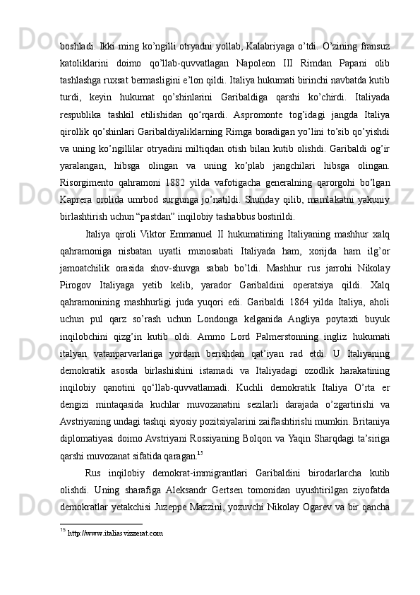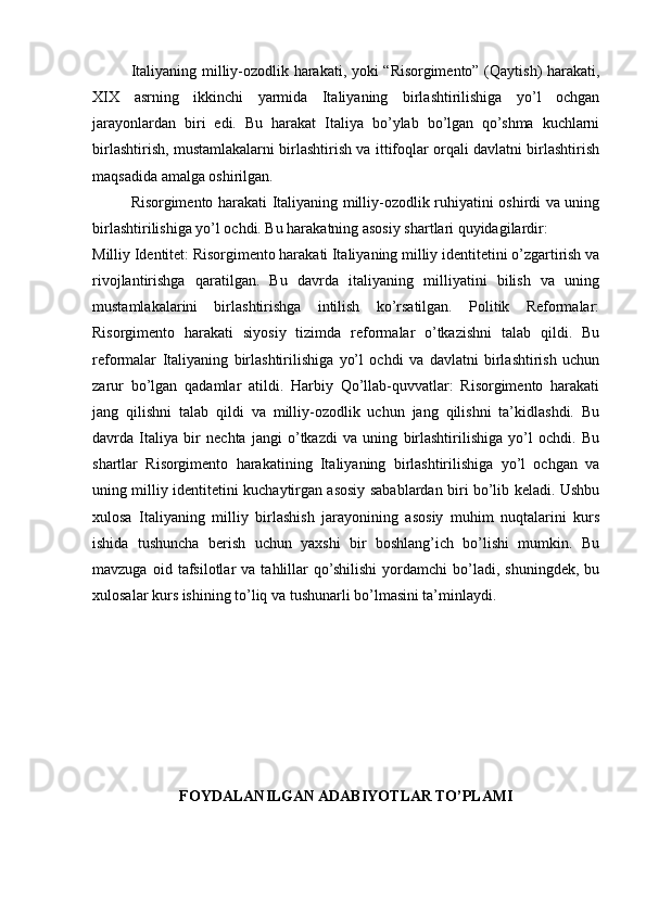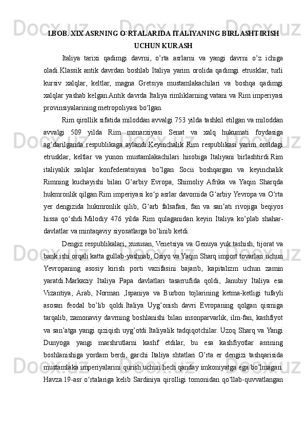 I.BOB. XIX ASRNING O`RTALARIDA ITALIYANING BIRLASHTIRISH UCHUN KURASH .................................................................................................3