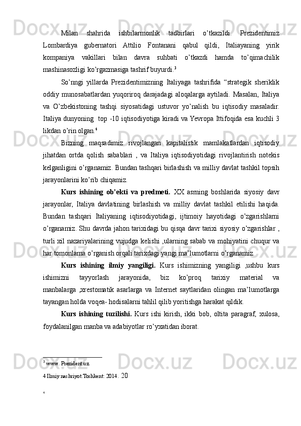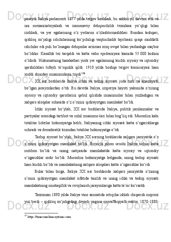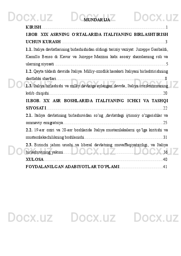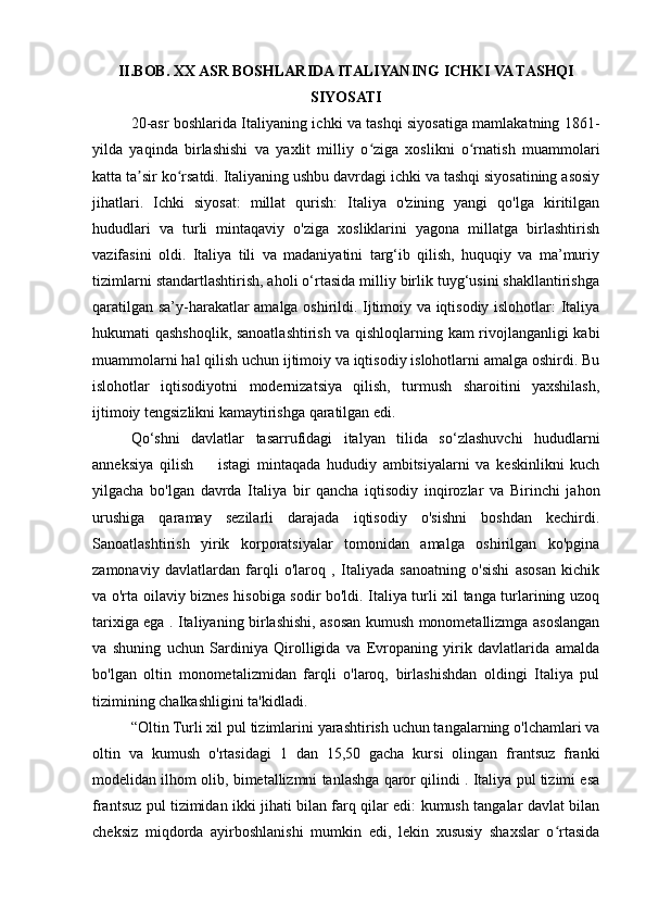 II.BOB. XX ASR BOSHLARIDA ITALIYANING ICHKI VA TASHQI SIYOSATI..............................................................................................................22