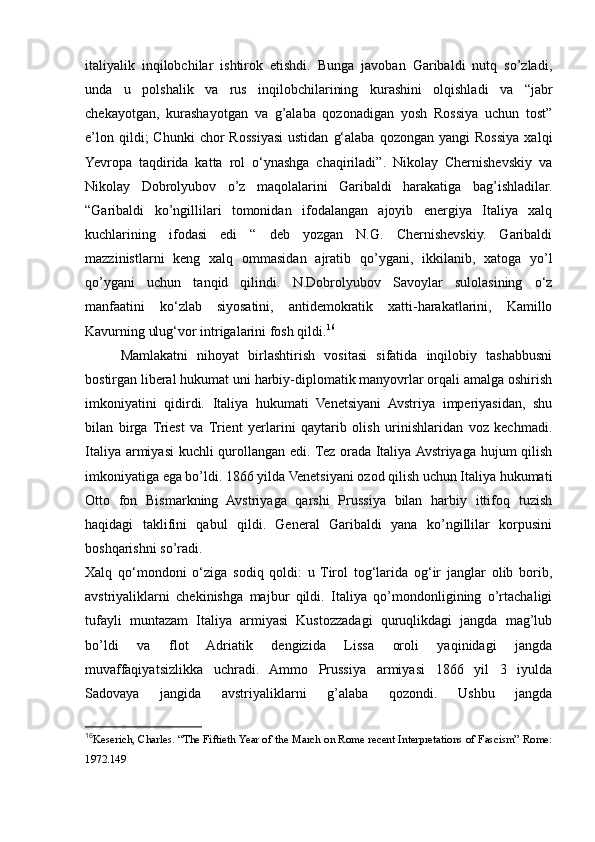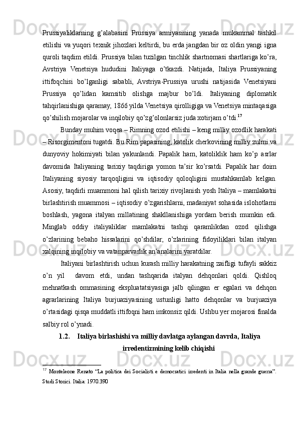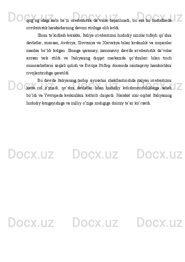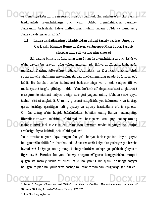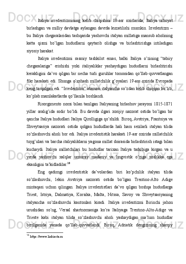 1.3. Italiya birlashishi va milliy davlatga aylangan davrda, Italiya irredentizmining kelib chiqishi...........................................................................................................20