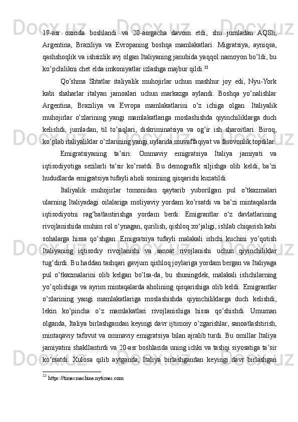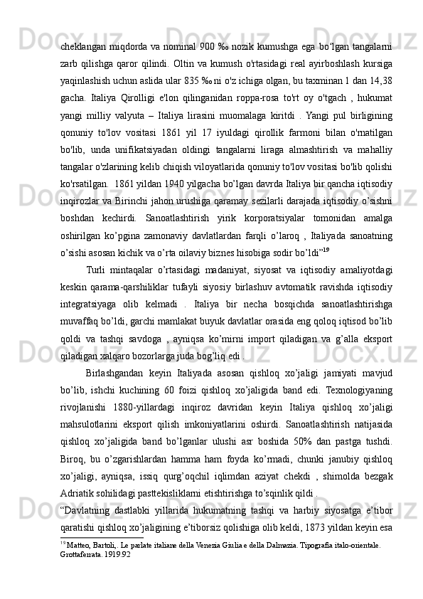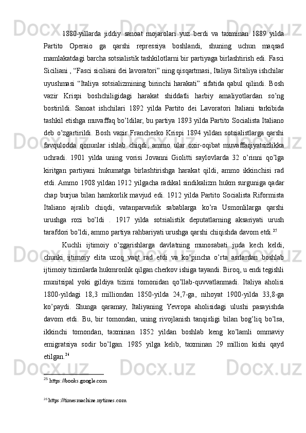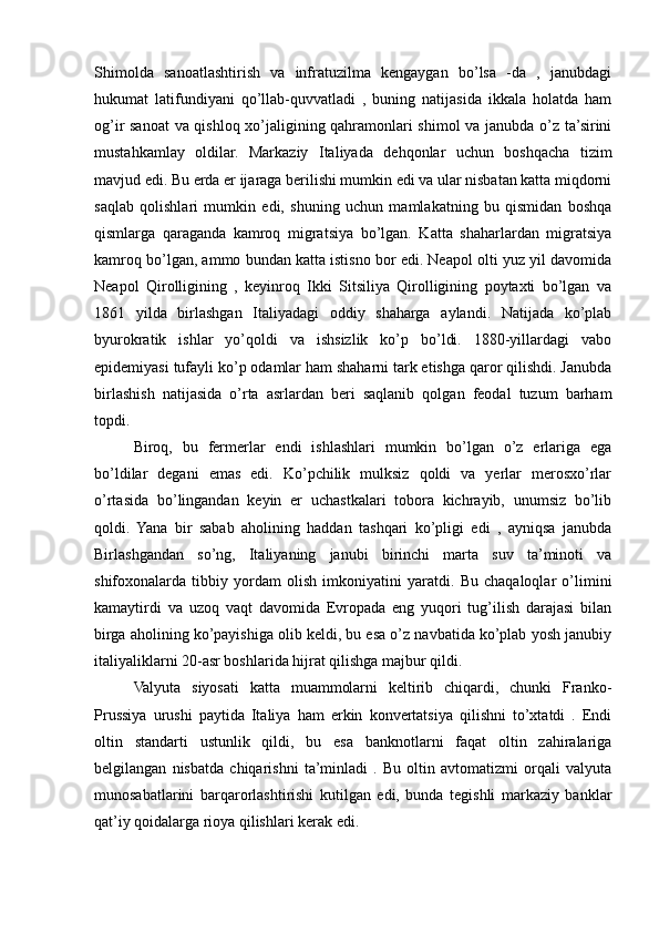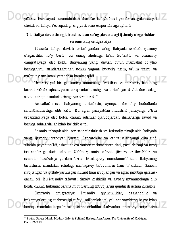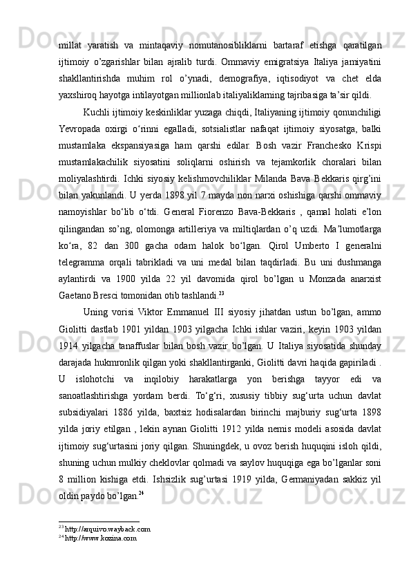 2.1. Italiyadavlatining birlashuvidan so’ng ,davlatdagi ijtimoiy o’zgarishlar va ommaviy emigratsiya..............................................................................................25