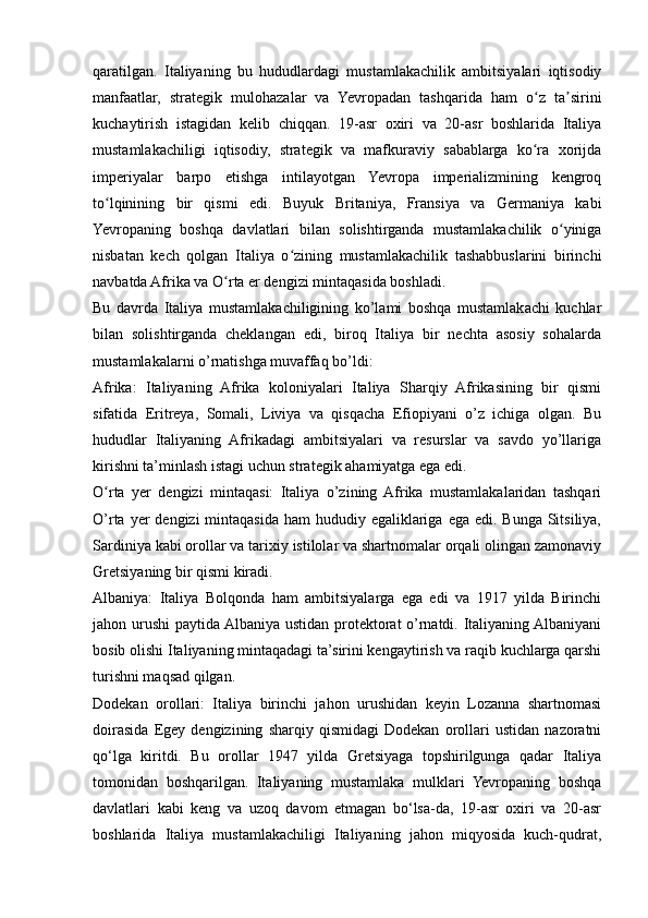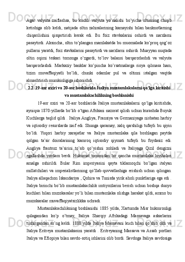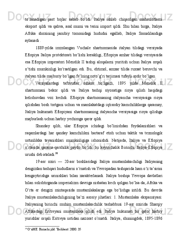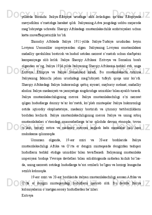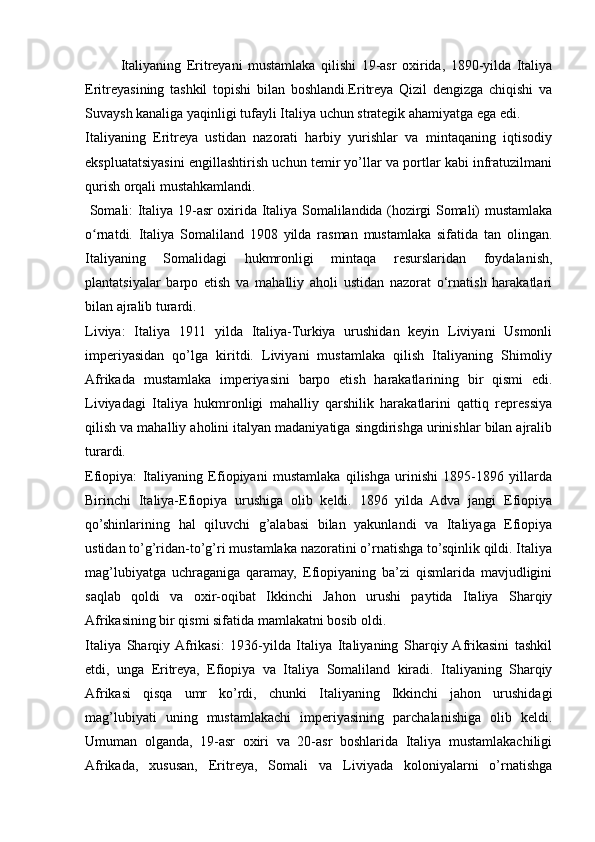 2.2. 19-asr oxiri va 20-asr boshlarida Italiya mustamlakalarni qoʻlga kiritishi va mustamlakachilikning boshlanishi..........................................................................31
