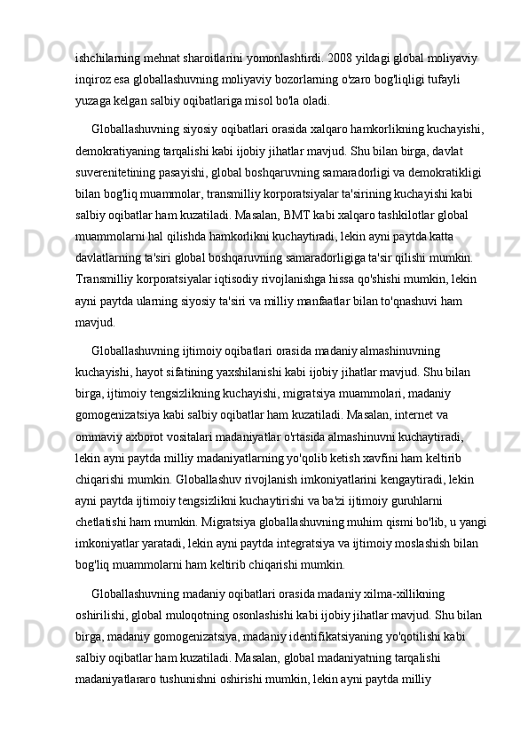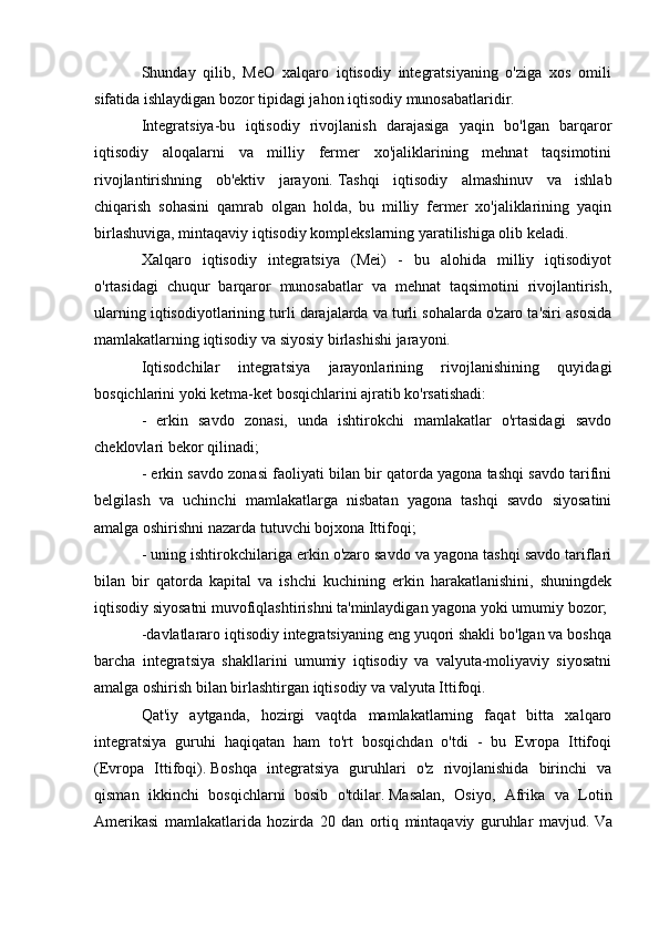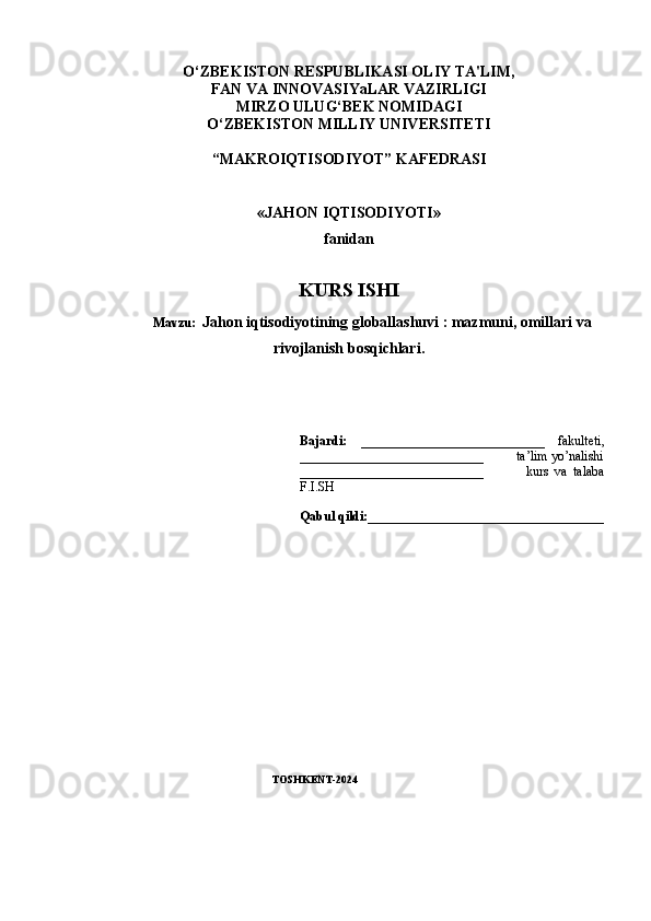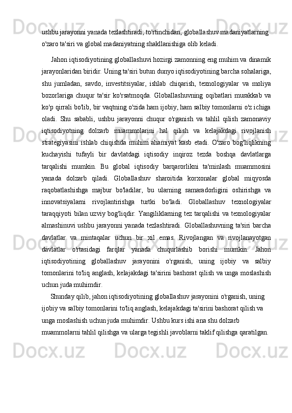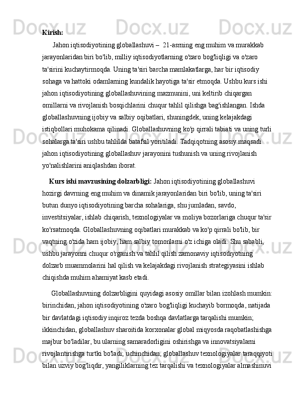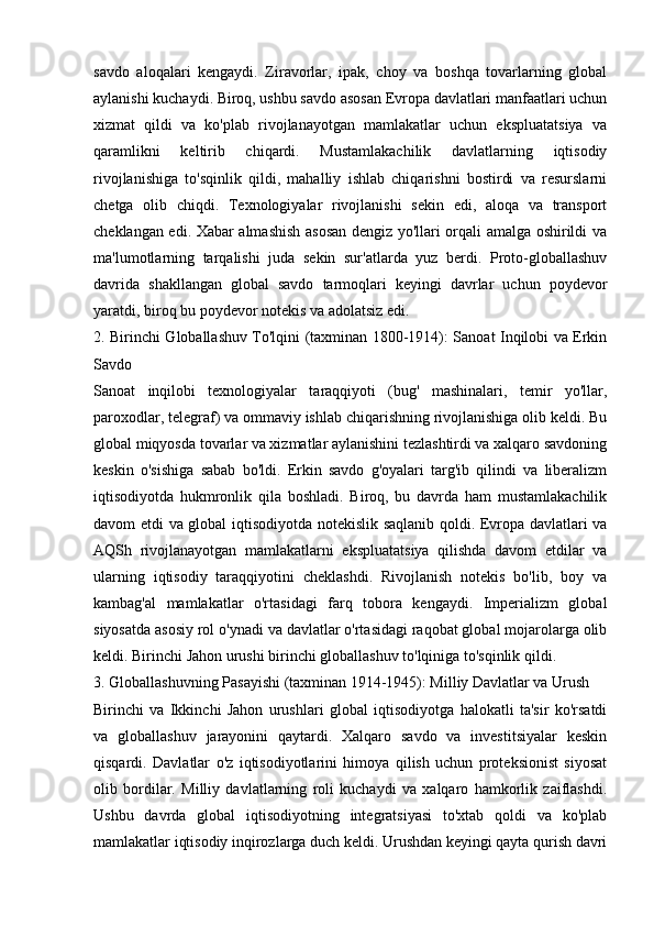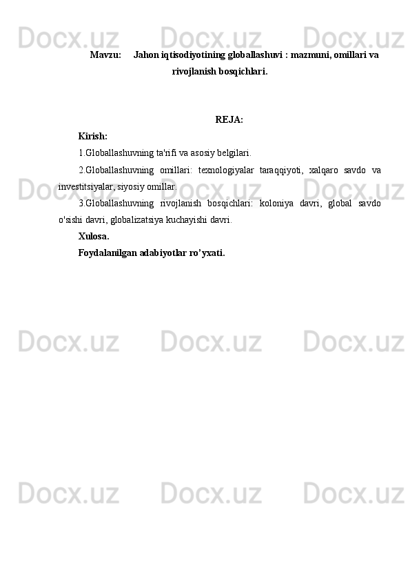 Jahon iqtisodiyotining globallashuvi : mazmuni, omillari va rivojlanish bosqichlari.