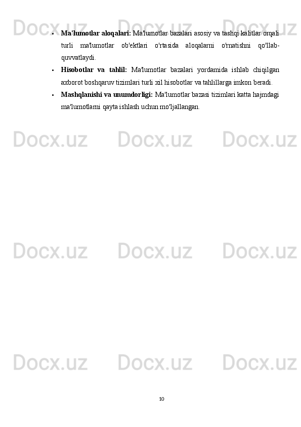 manipulyatsiya   qilish   imkonini   beradi.   Ma'lumotlar   bazasi   imkoniyatlaridan   ba'zi