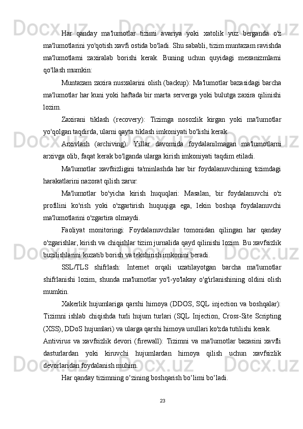 Har   qanday   ma'lumotlar   tizimi   avariya   yoki   xatolik   yuz   berganda   o'z
