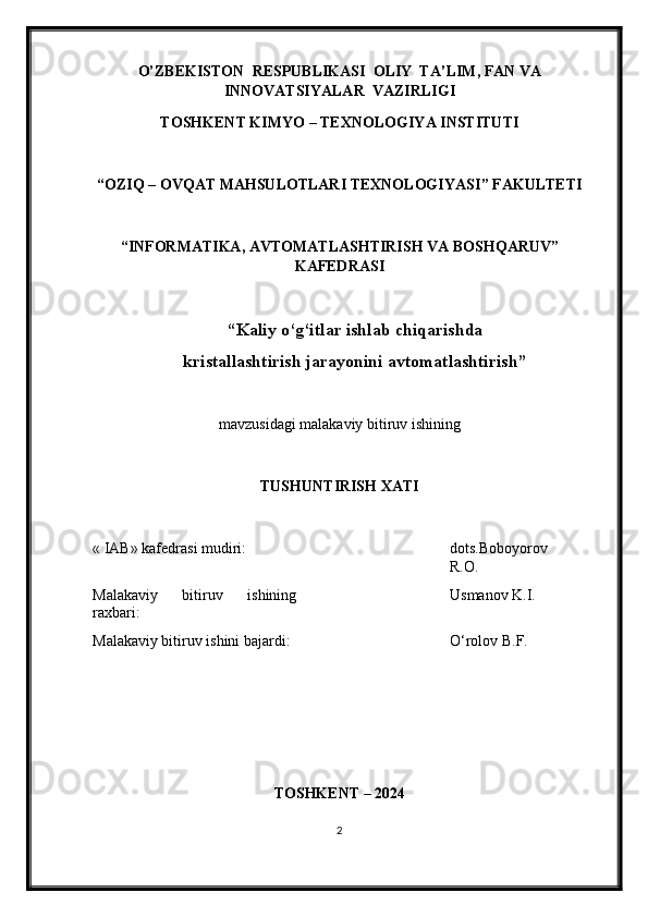 Kaliy o‘g‘itlar ishlab chiqarishda kristallashtirish jarayonini avtomatlashtirish