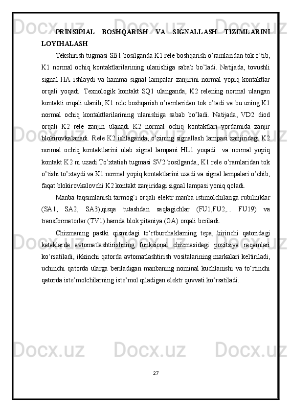 o’tishi to’xtaydi va K1 normal yopiq kontaktlarini uzadi va signal lampalari o’chib,
