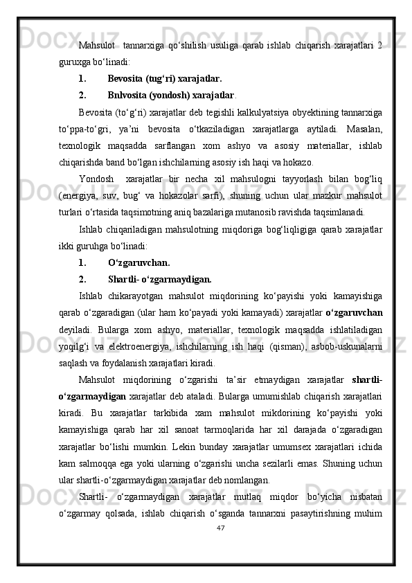 o‘zgarma y digan   xarajatlar  deb   ataladi.  Bularga  umumishlab  chiqarish   xarajatlari