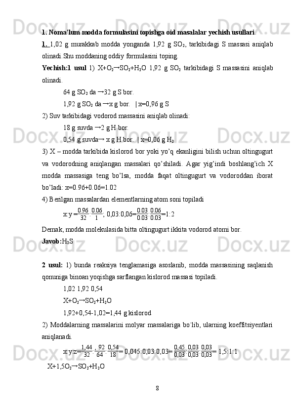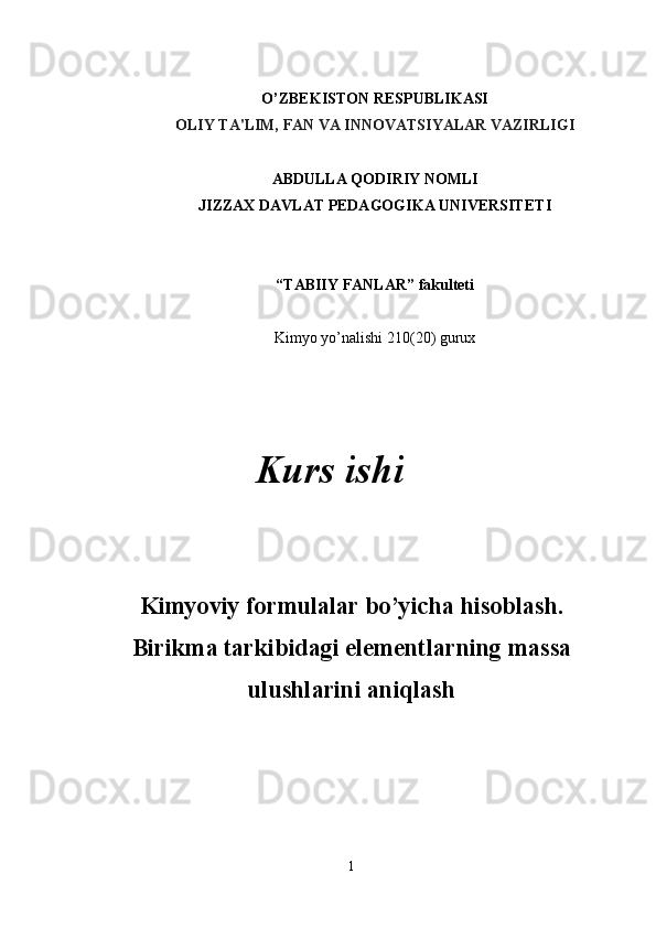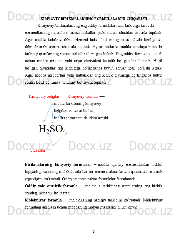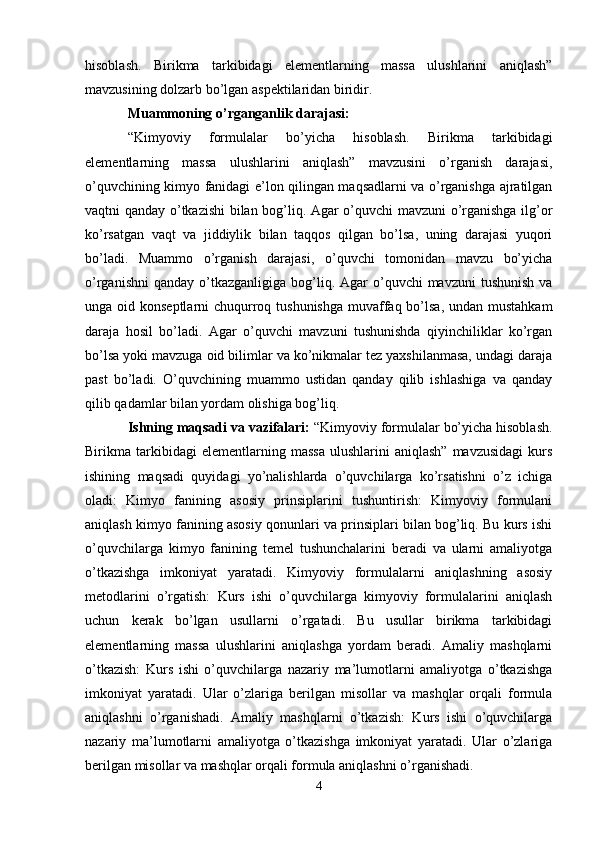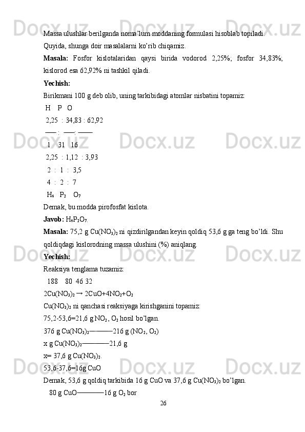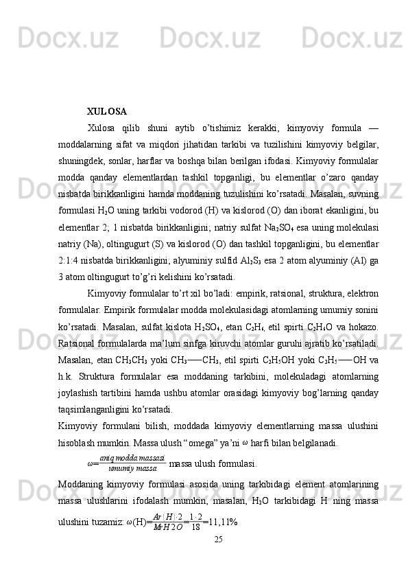 Kimyoviy formulalar bo’yicha hisoblash. Birikma tarkibidagi elementlarning massa ulushlarini aniqlash
