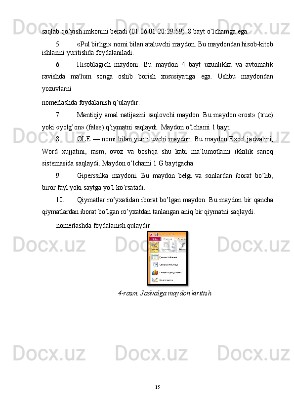 8. OLE — nomi bilan yuritiluvchi maydon. Bu maydon Excel jadvalini,