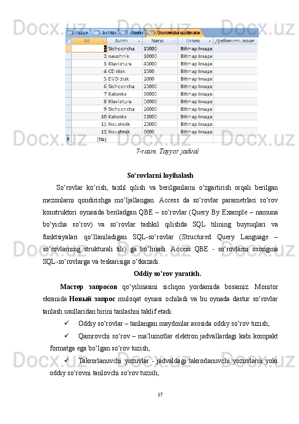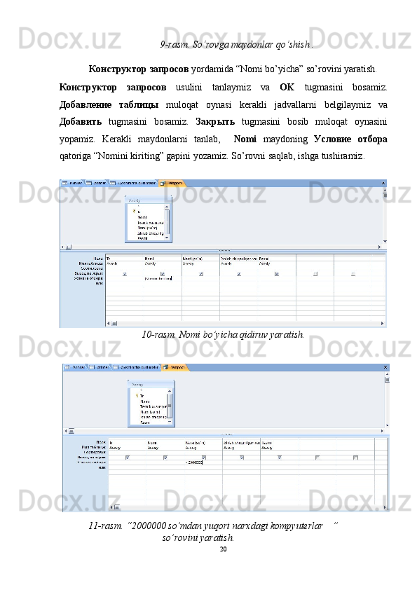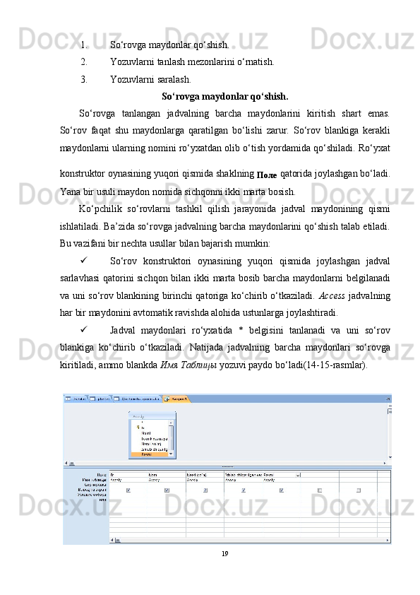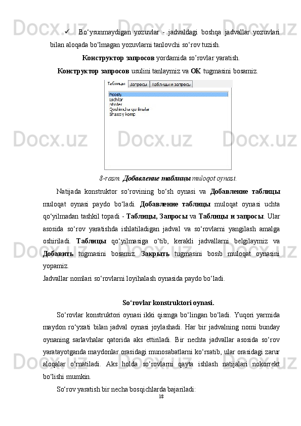 Конструктор   запросов   yordamida so’rovlar yaratish.