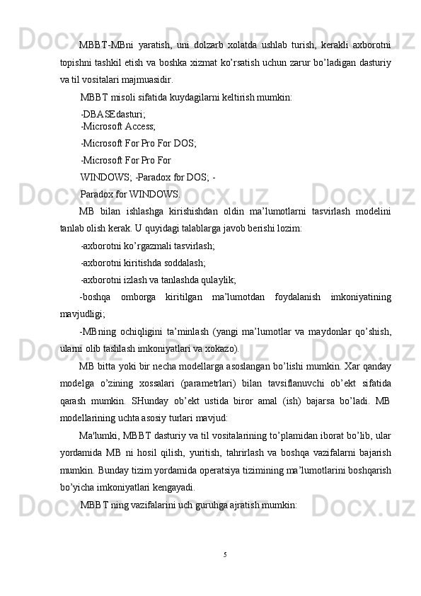 Ma'lumki, MBBT dasturiy va til vositalarining to’plamidan iborat bo’lib, ular