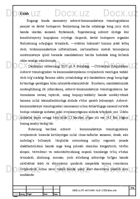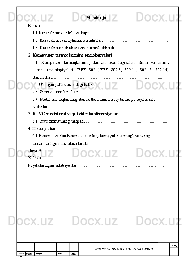 | 1.1 Kurs ishining tarkibi va hajmi…………………………………………..….. | |