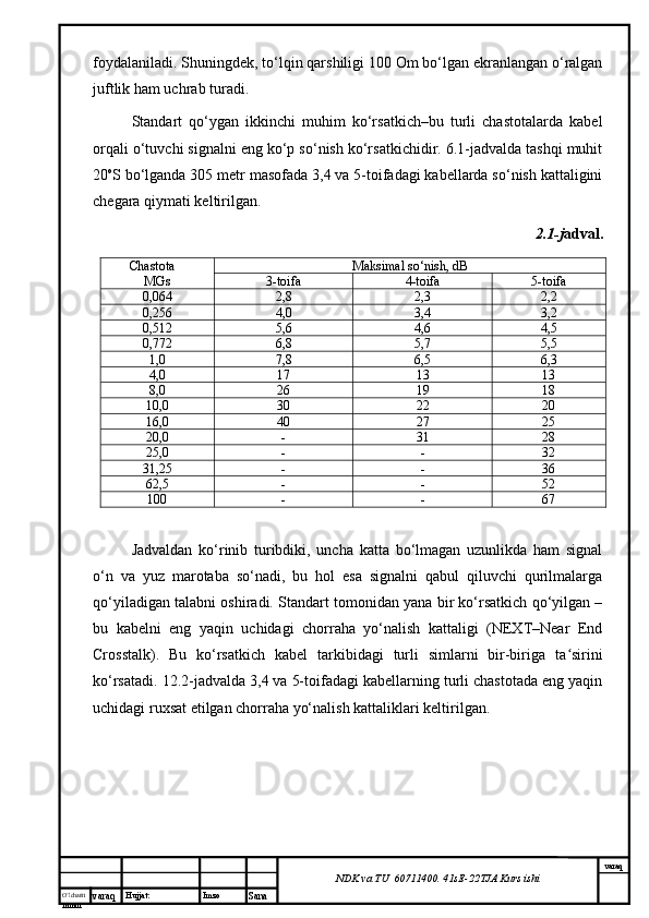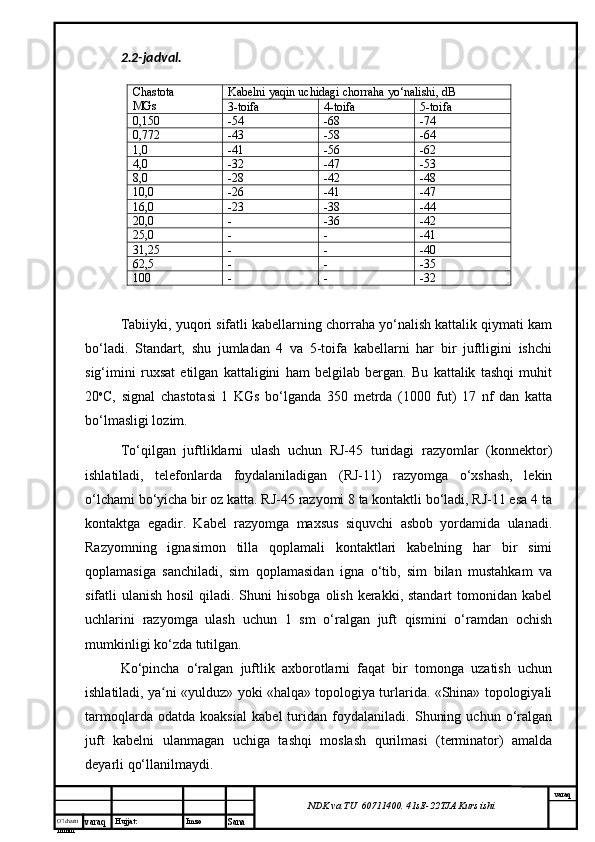 | 2.2 O‘ralgan juftlik asosidagi kabellar................................................................. | |