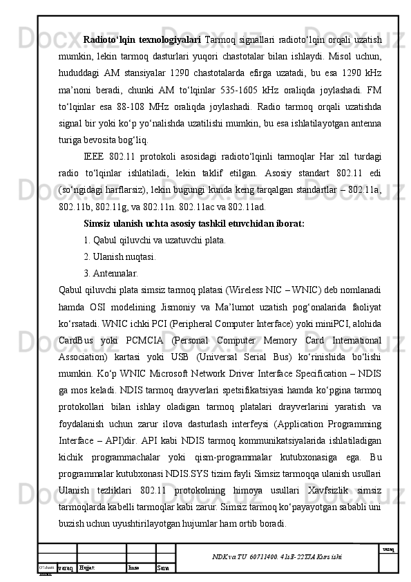 | 2.1. Kompyuter tarmoqlarining standart texnologiyalari. Simli va simsiz tarmoq texnologiyalari, IEEE 802 (IEEE 802.3, 802.11, 802.15, 802.16) standartlari............................................................................................................ | |