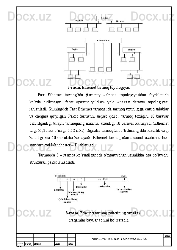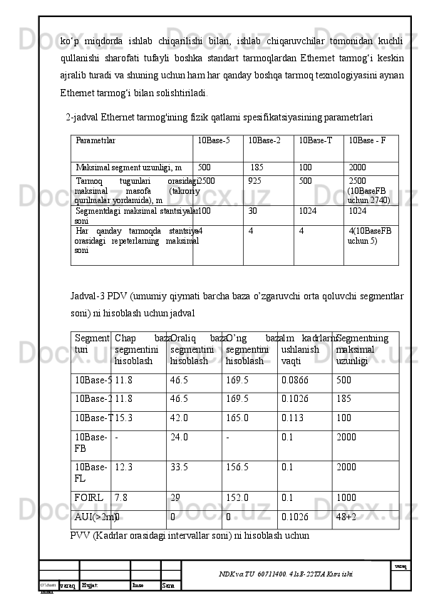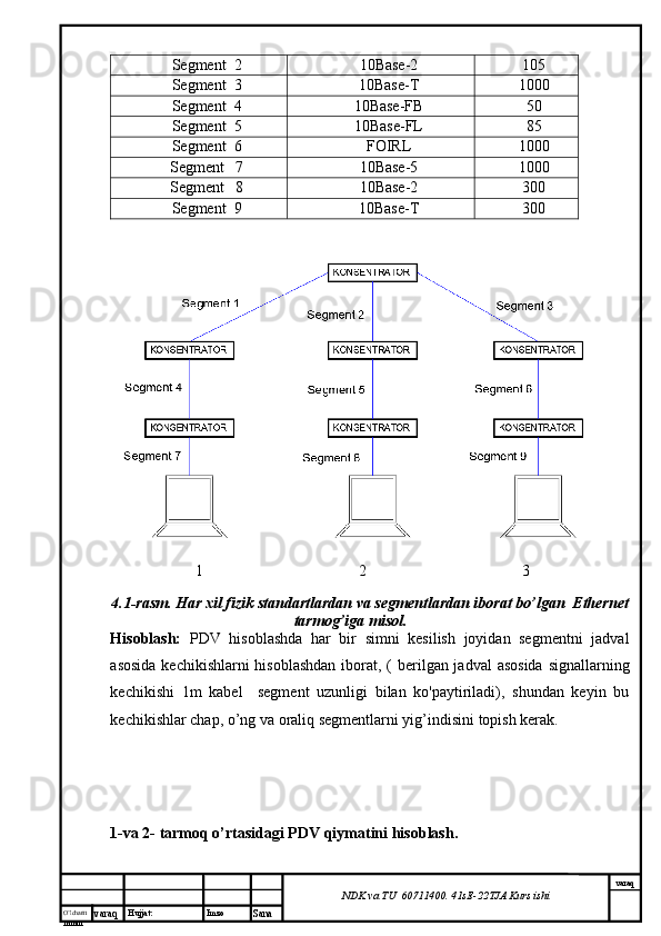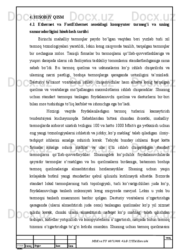 | 4.1 Ethernet va FastEthernet asosidagi kompyuter tarmog'i va uning samaradorligini hisoblash tartibi.......................................................................... | |