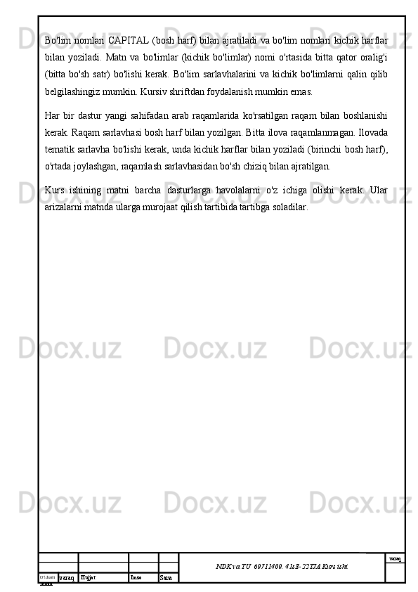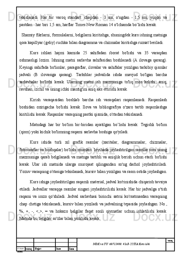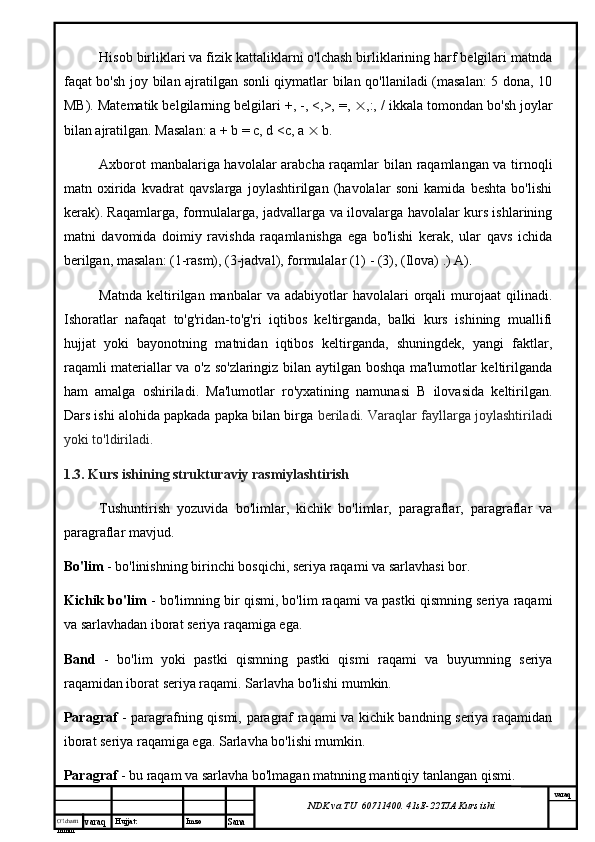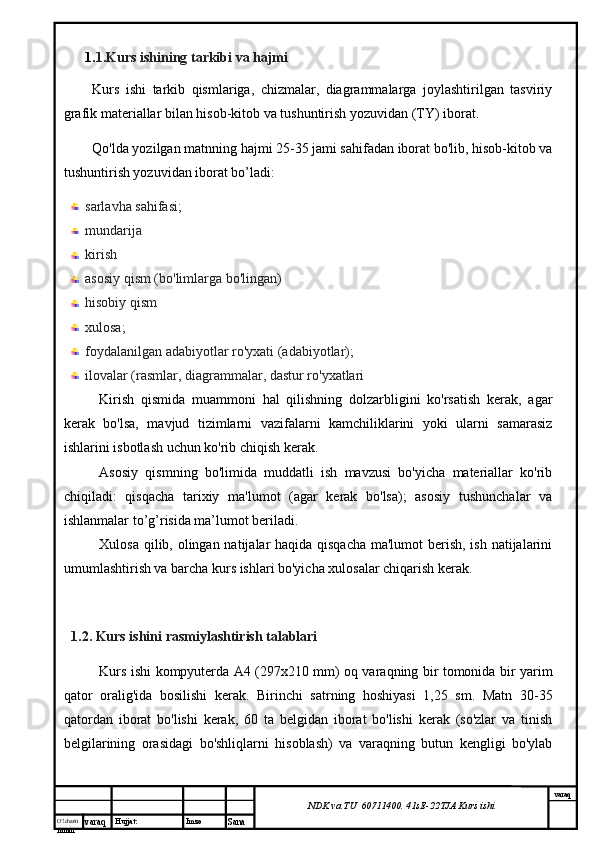 | 1.2. Kurs ishini rasmiylashtirish talablari…………………………………........ | |