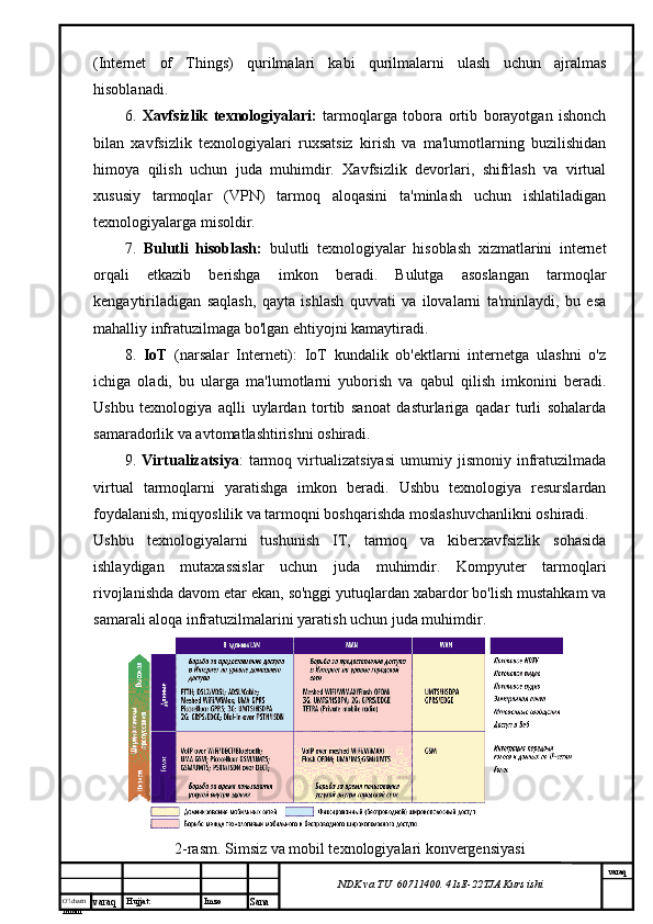 | 2.4. Mobil tarmoqlarining standartlari, zamonaviy tarmoqni loyihalash dasturlar................................................................................................................ | |
