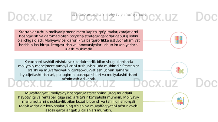 ta'minlashlari kerak.Startaplar uchun moliyaviy menejment kapital qo'yilmalar, xarajatlarni