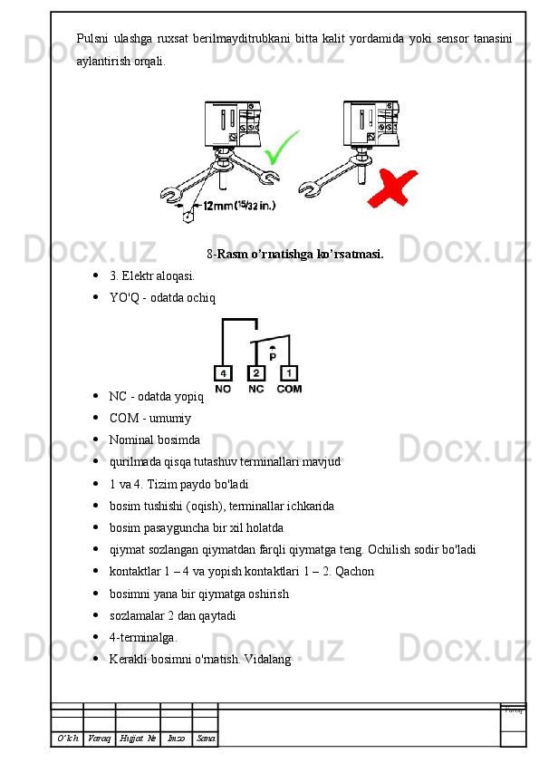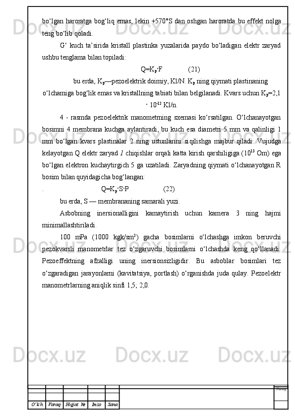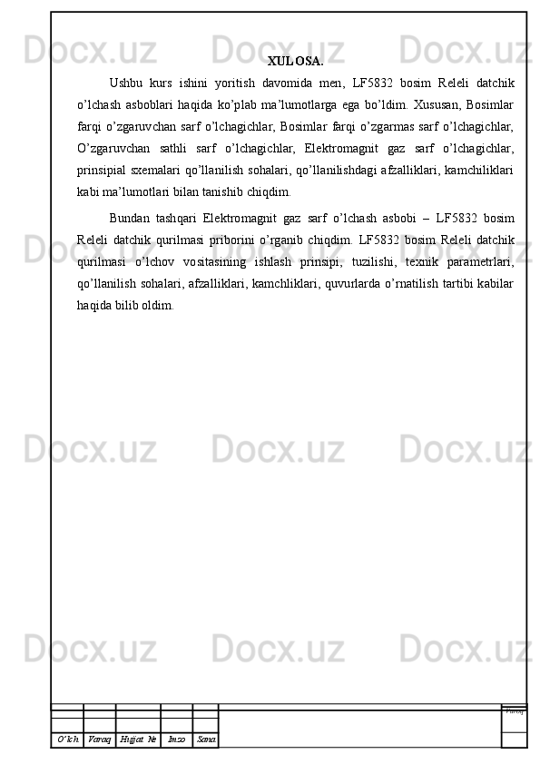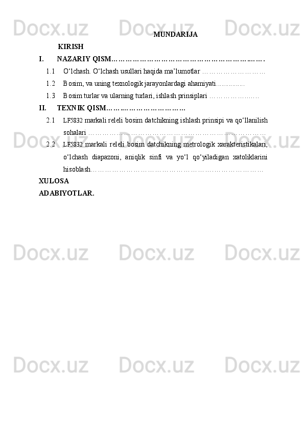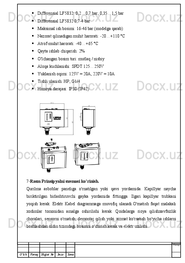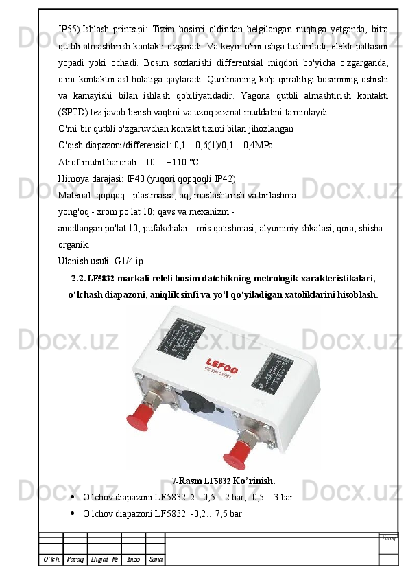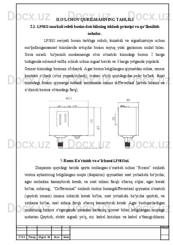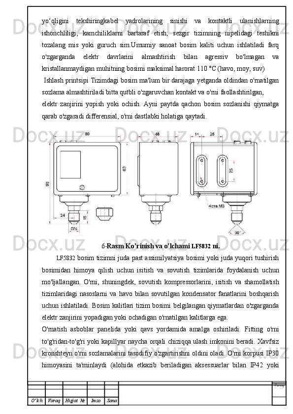 | 2.1 | LF5832 markali releli bosim datchikning ishlash prinsipi va qo‘llanilish sohalari ………………………………………………………………… | ||