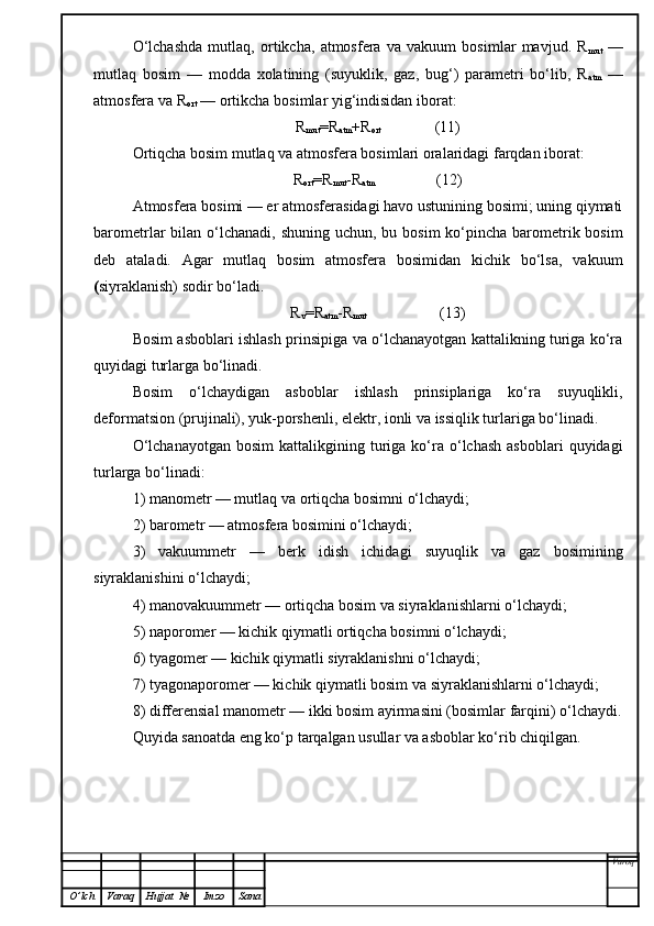 | 1.2 | Bosim, va uning texnologik jarayonlardagi ahamiyati................ | ||
