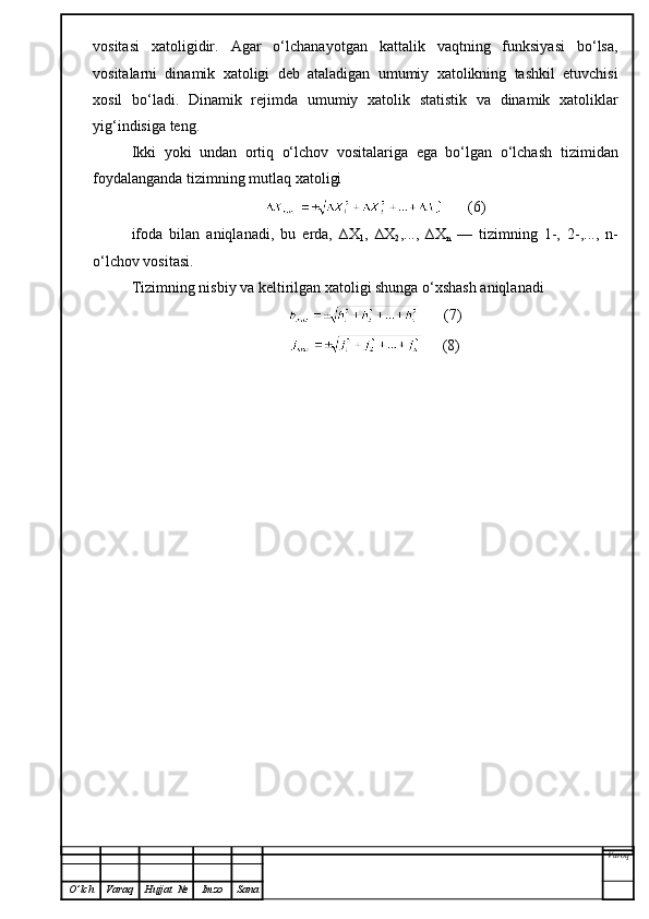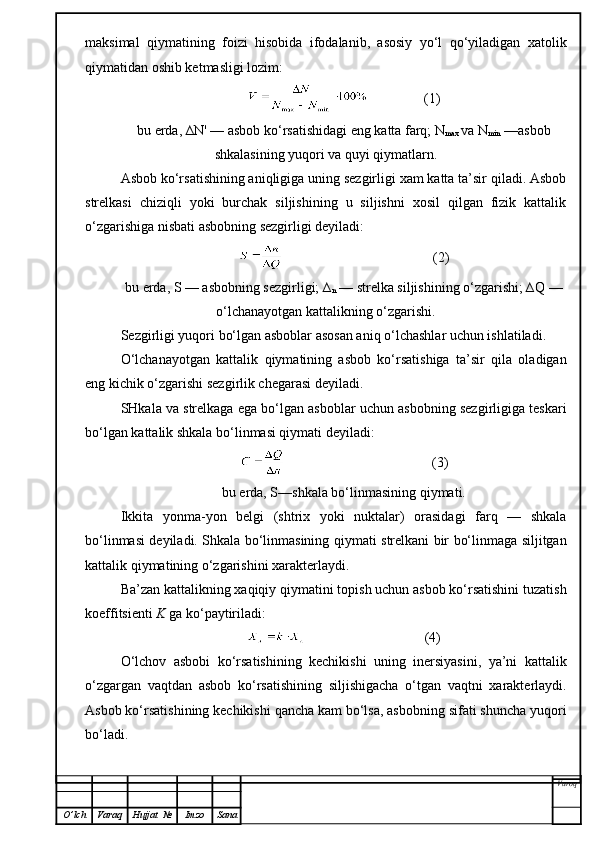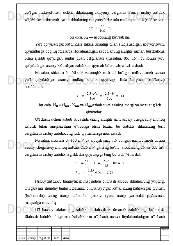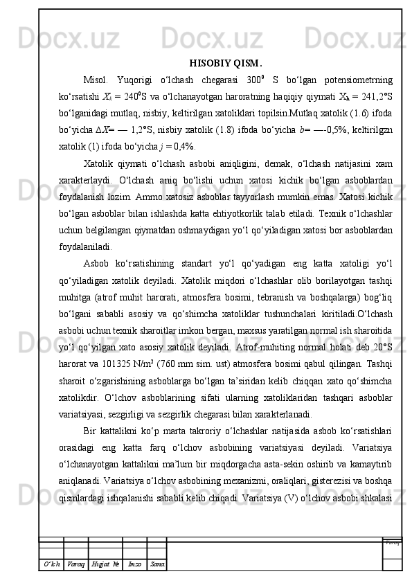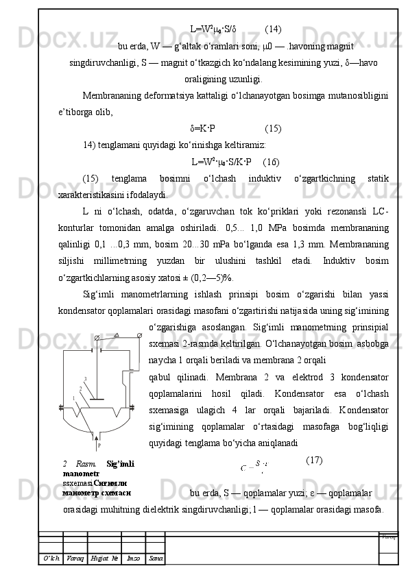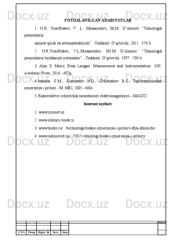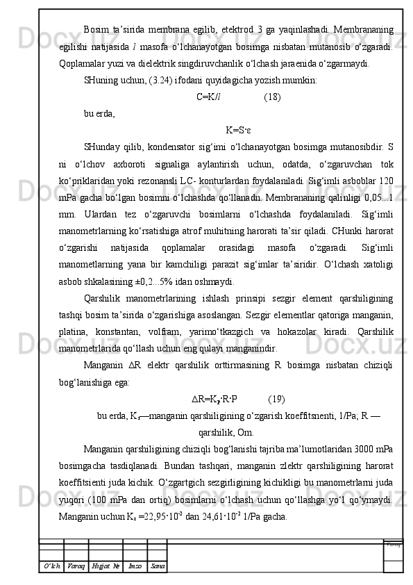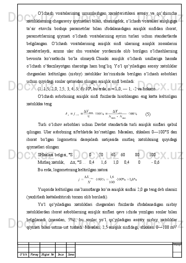 | 2.2 | LF5832 markali releli bosim datchikning metrologik xarakteristikalari, o‘lchash diapazoni, aniqlik sinfi va yo‘l qo‘yiladigan xatoliklarini hisoblash…………………………………………….………………… | ||