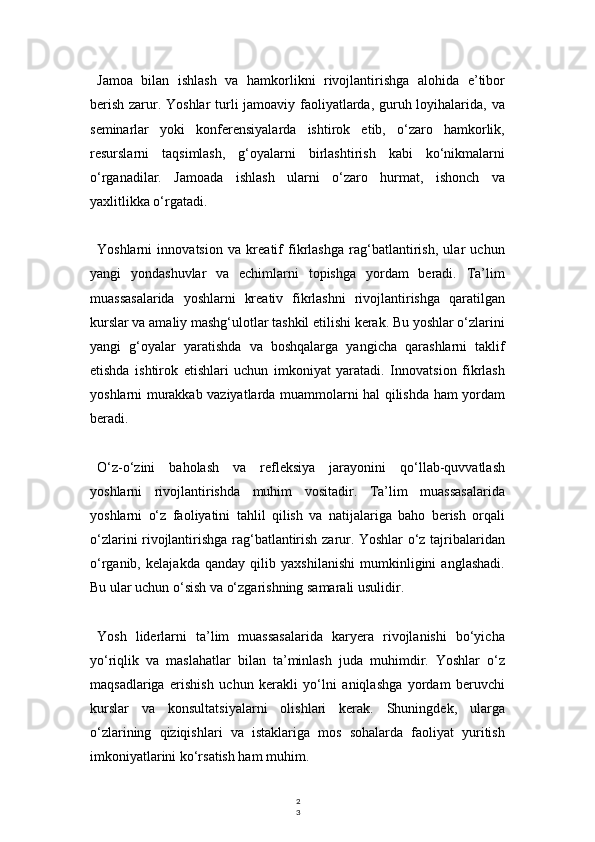 Lider va tashkilotchi yoshlarni ijtimoiy pedagogik qoʻllab-quvvatlash mexanizlarini takomillashtirish