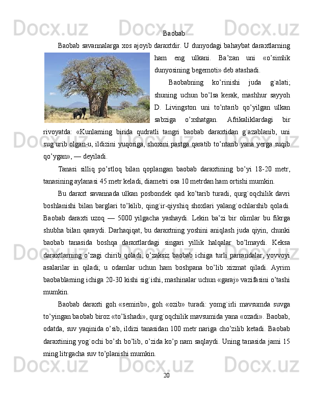 Baobab   —   savannalardagi   ajoyib   daraxtdir.   U   dunyodagi   bahaybat   daraxtning