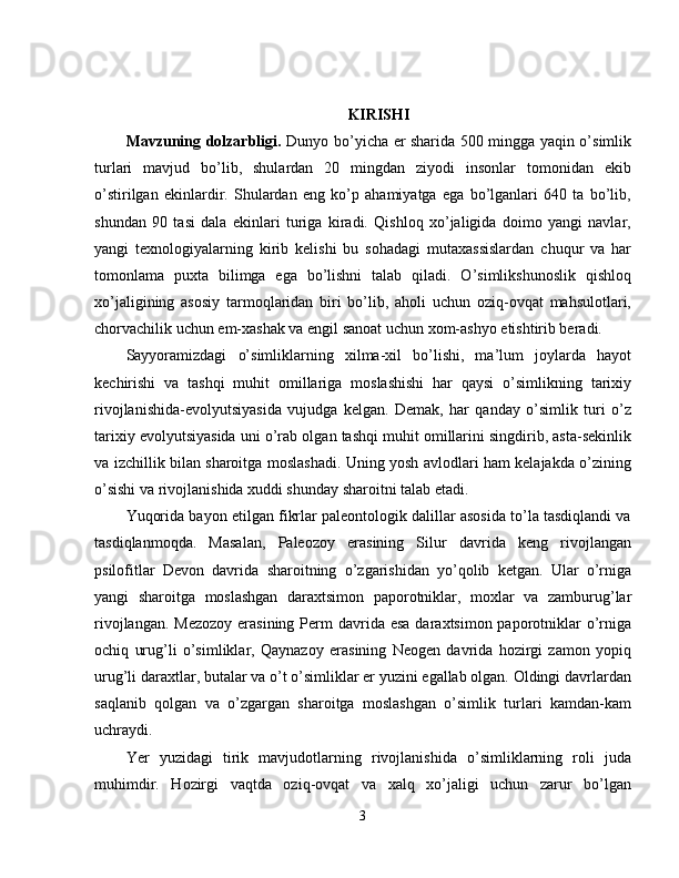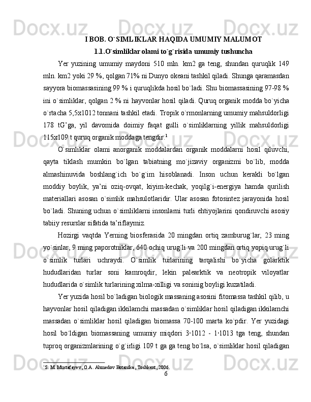 I BOB. O`SIMLIKLAR HAQIDA UMUMIY MALUMOT……………………....6