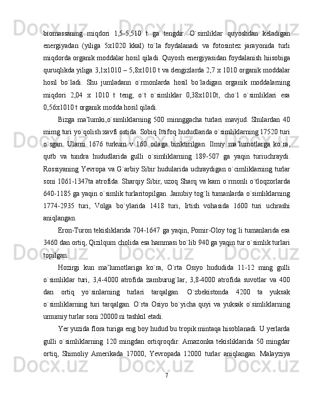 hosil   bo`ldigan   biomassaning   umumiy   miqdori   3·1012   -   1·1013   tga   teng,   shundan