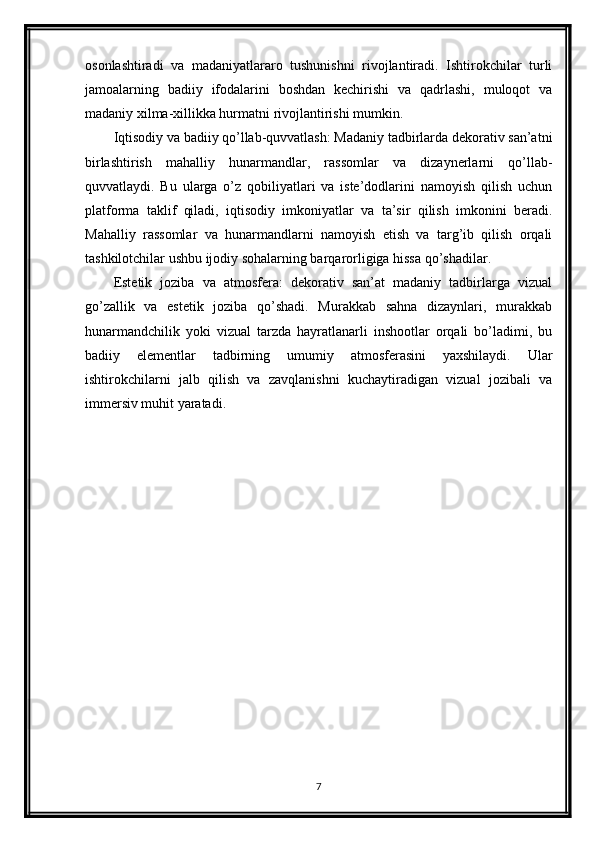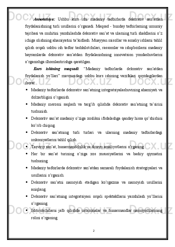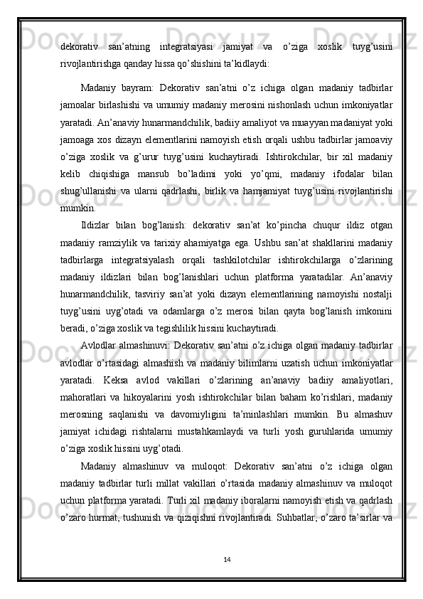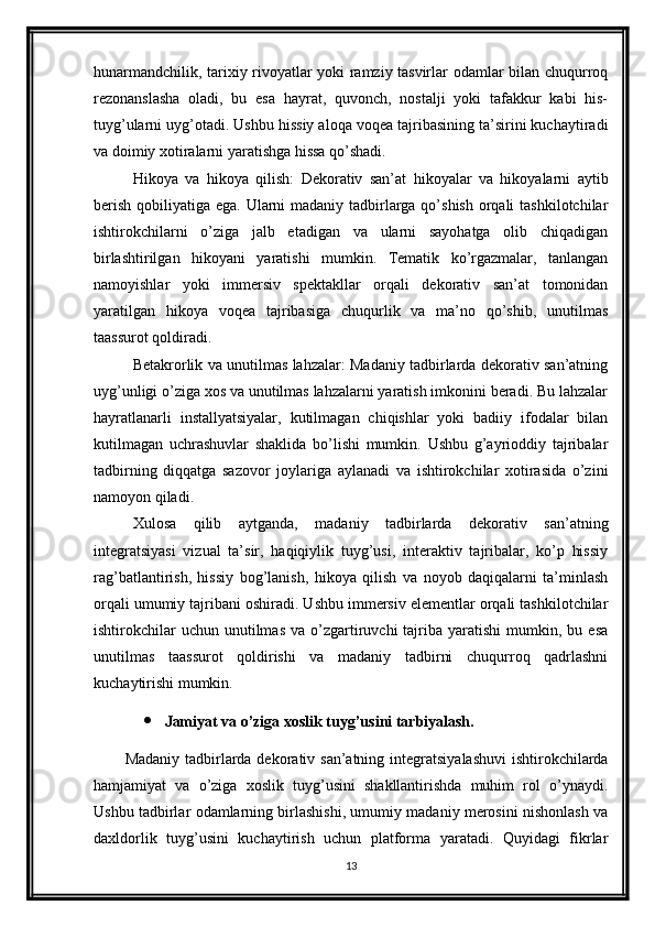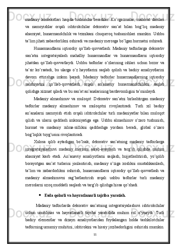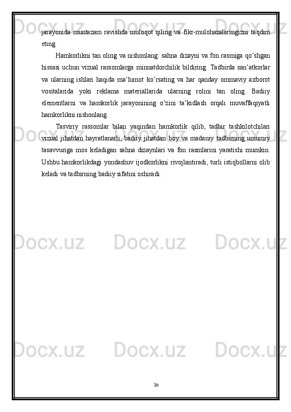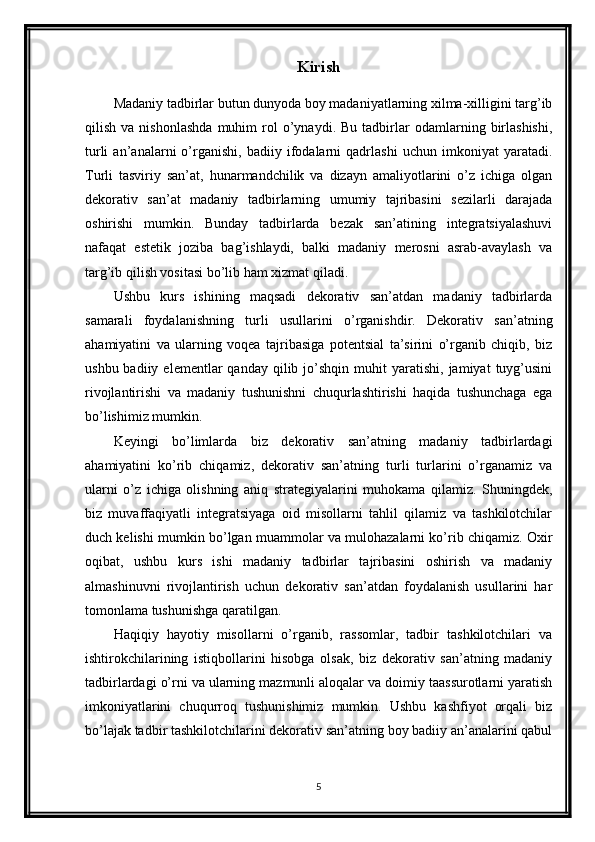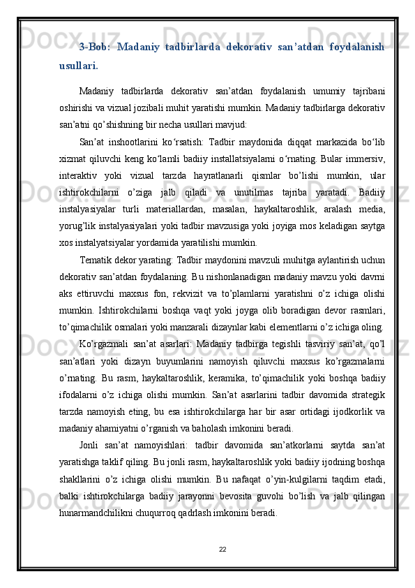 Madaniy tadbirlarda badiiy bezak sanatidan foydalanish yo’llari