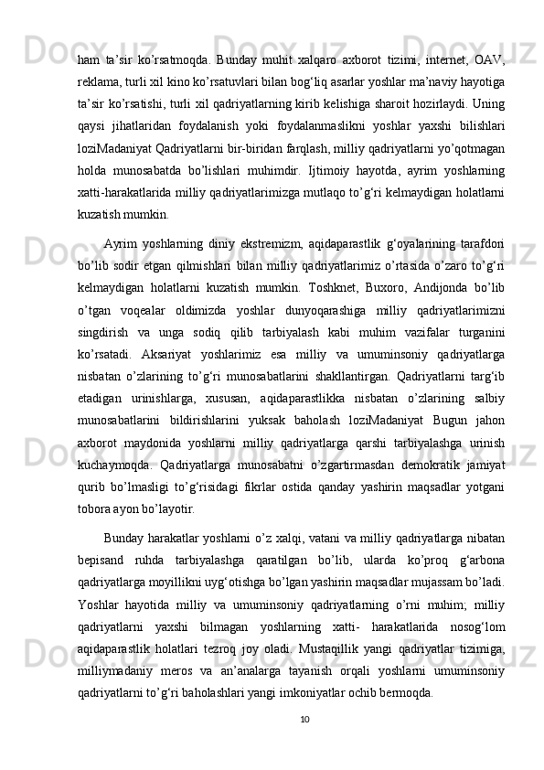 turgani yо’q. Turli xalqlarga xos bо’lgan qadriyatlar О’zbekiston yoshlari hayotiga