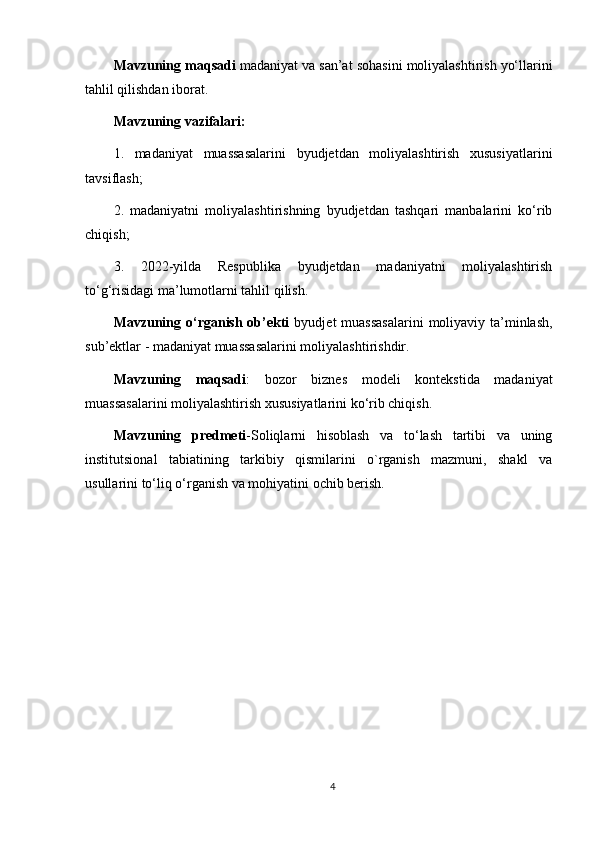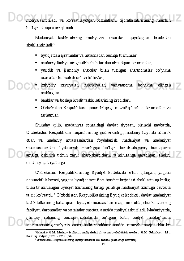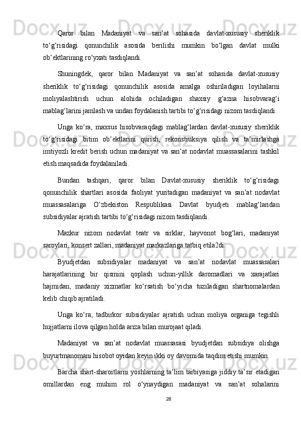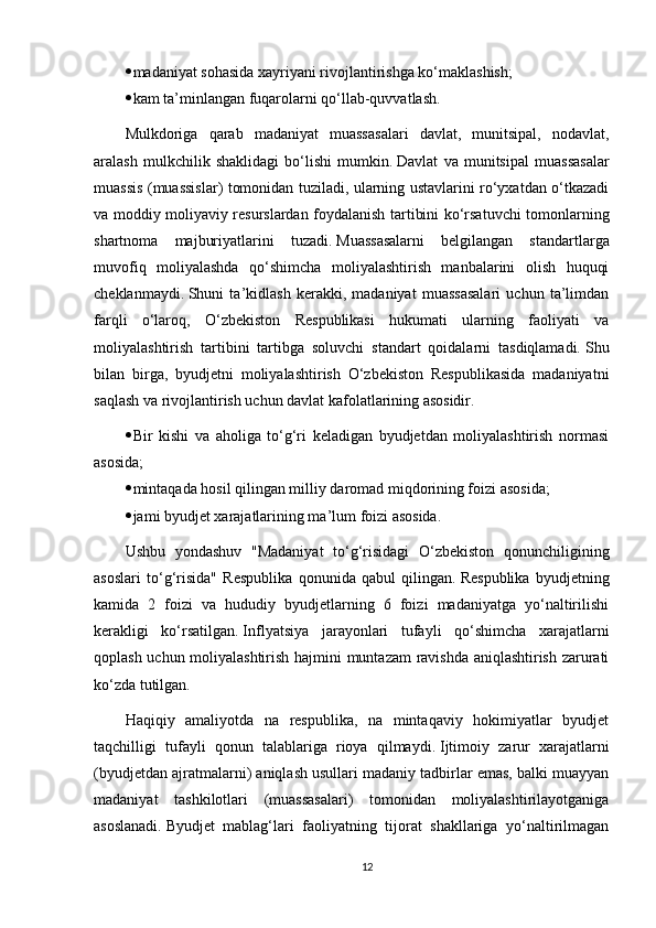 Madaniyat   sohasida   byudjetdan   moliyashtirish   erkinlik   qonunga   asoslanadi: