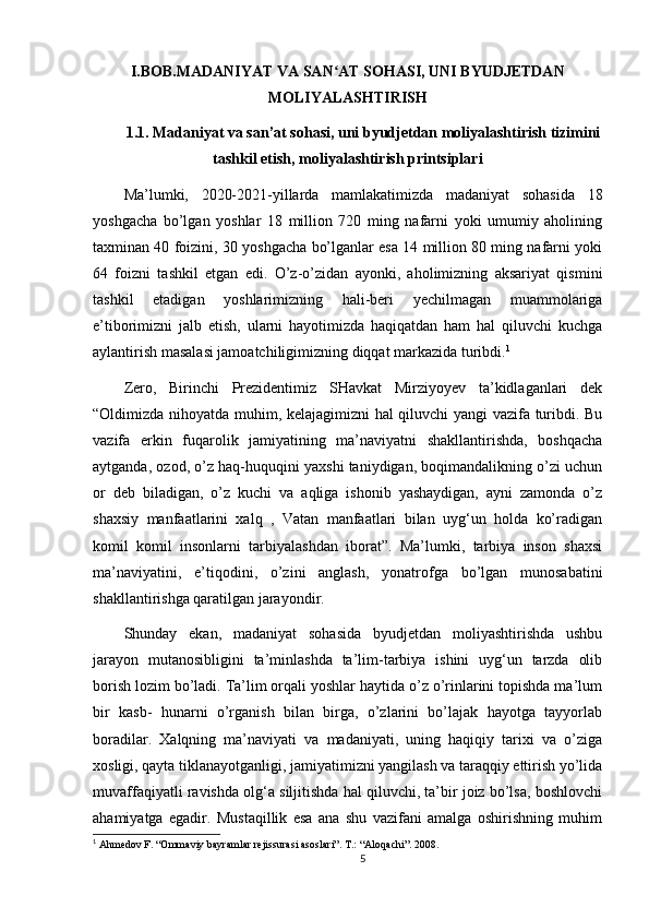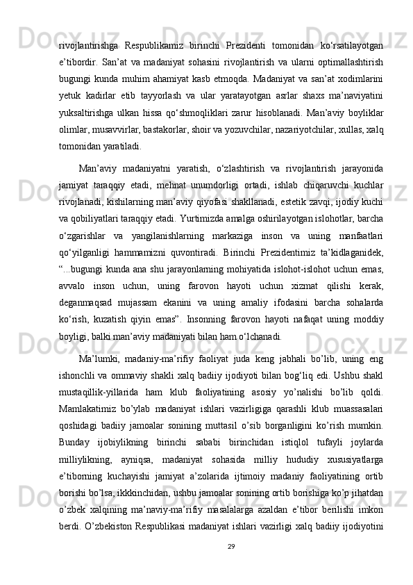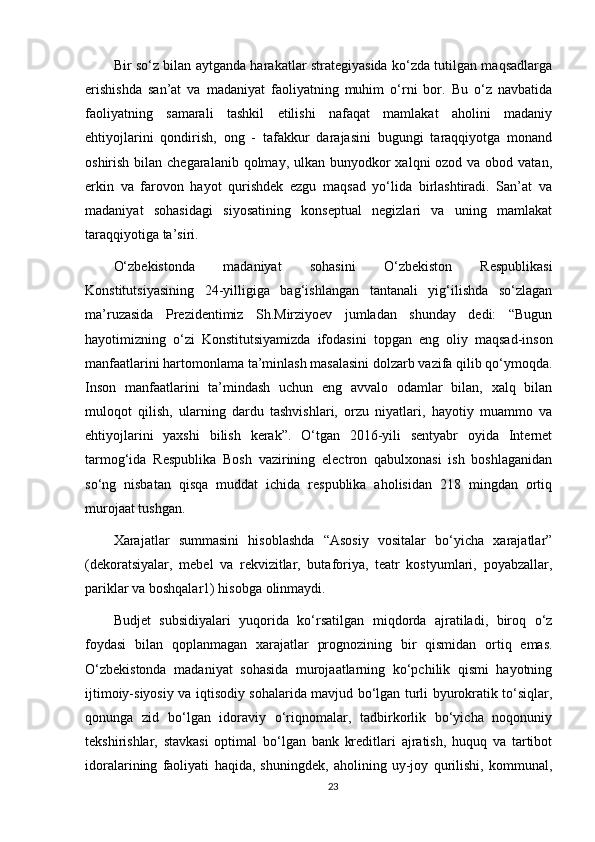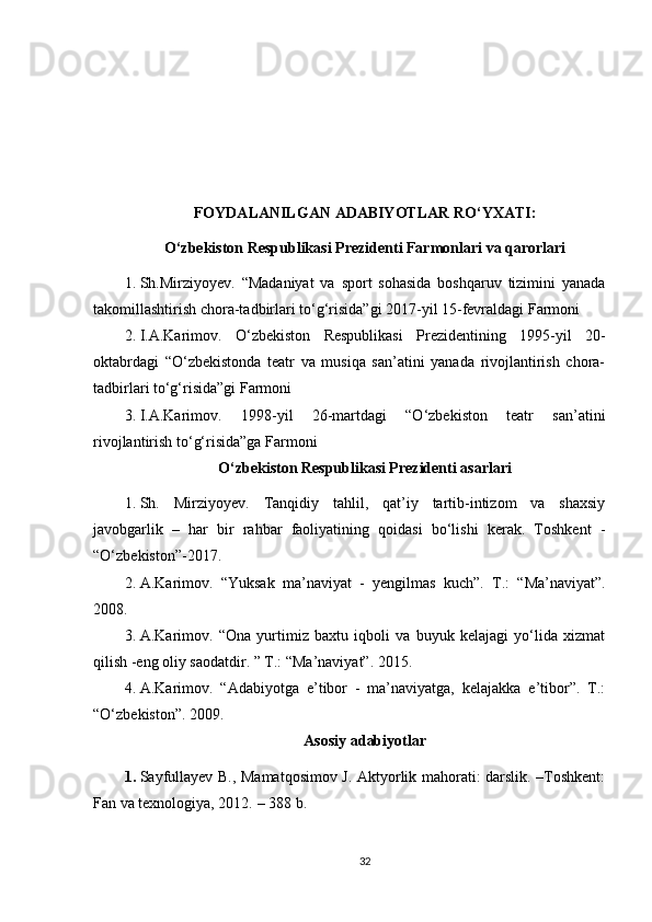 1. Sh.Mirziyoyev.   “Madaniyat   va   sport   sohasida   boshqaruv   tizimini   yanada