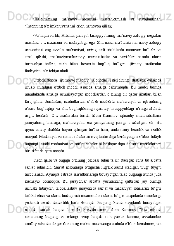 milliy-ma’naviy   qadriyatlarga   tayanish,   uning   talqini   va   jamiyatimizda   iqtisodiy-