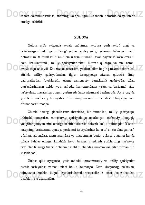 milliy  qadriyatlari   negizida  tarbiyalash  mumkin.  Biroq jamiyat   hayotining  barcha