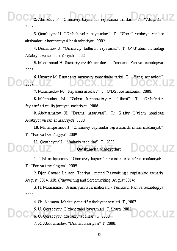 Dushamov J. “Ommaviy tadbirlar rejissurasi”. T. G‘.G‘ulom nomidagi Adabiyot va san’at nashriyoti. 2002.