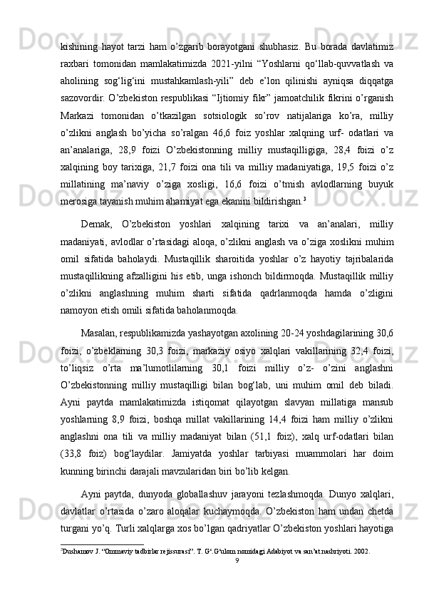 omil   sifatida   baholaydi.   Mustaqillik   sharoitida   yoshlar   о’z   hayotiy   tajribalarida