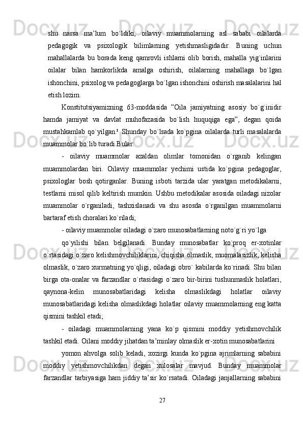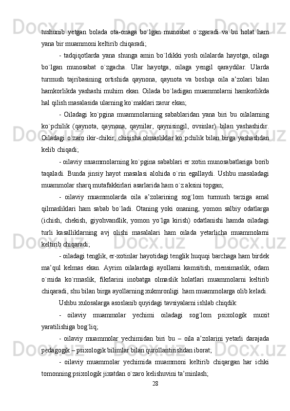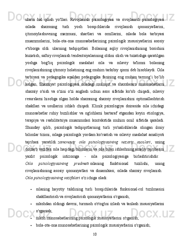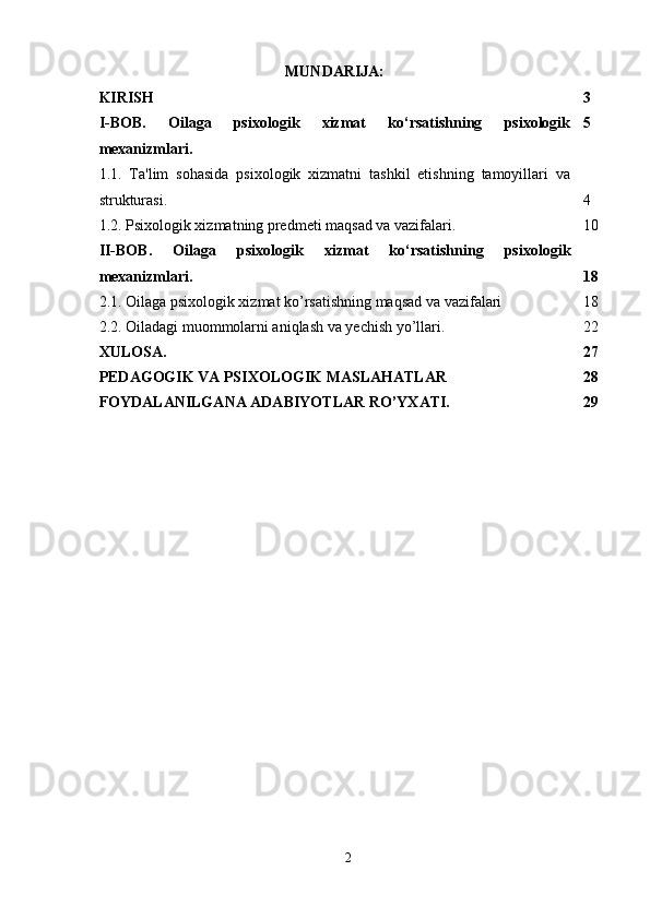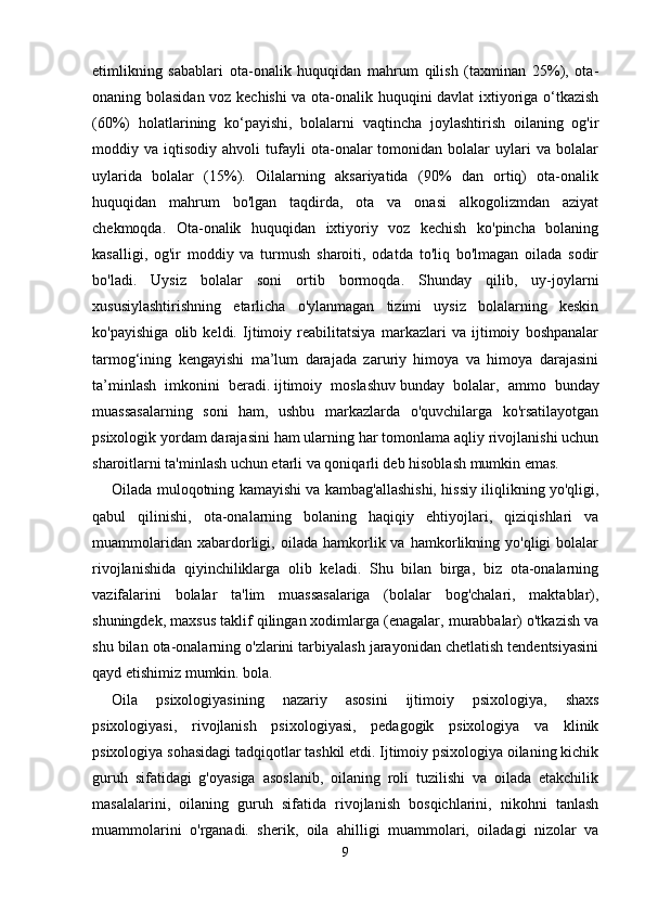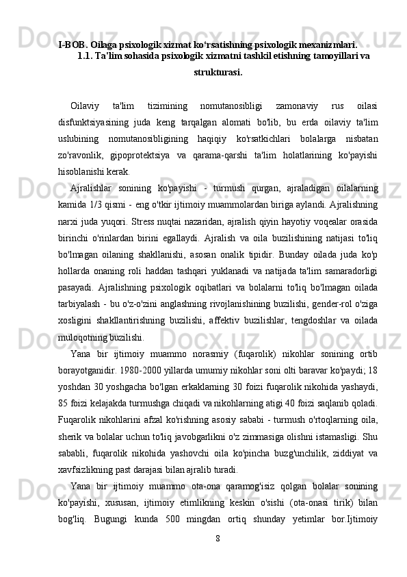 Mahallalarda psixologik xizmatni tashkil etishning ijtimoiy-psixologik asoslari (nosog'lom muhitidagi oila bilan ishlash).