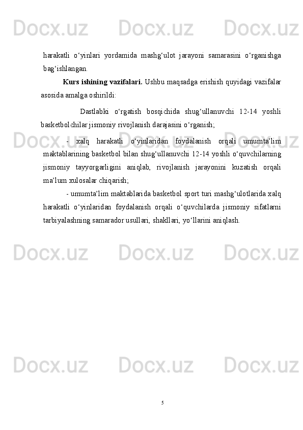 Kurs ishining maqsadi. Dastlabki o‘rgatish bosqichida shug‘ullanayotgan yosh basketbolchilarni maxsus mashqlar qo‘llash orqali harakatli o‘yinlari yordamida mashg‘ulot jarayoni samarasini o‘rganishga bag‘ishlangan.