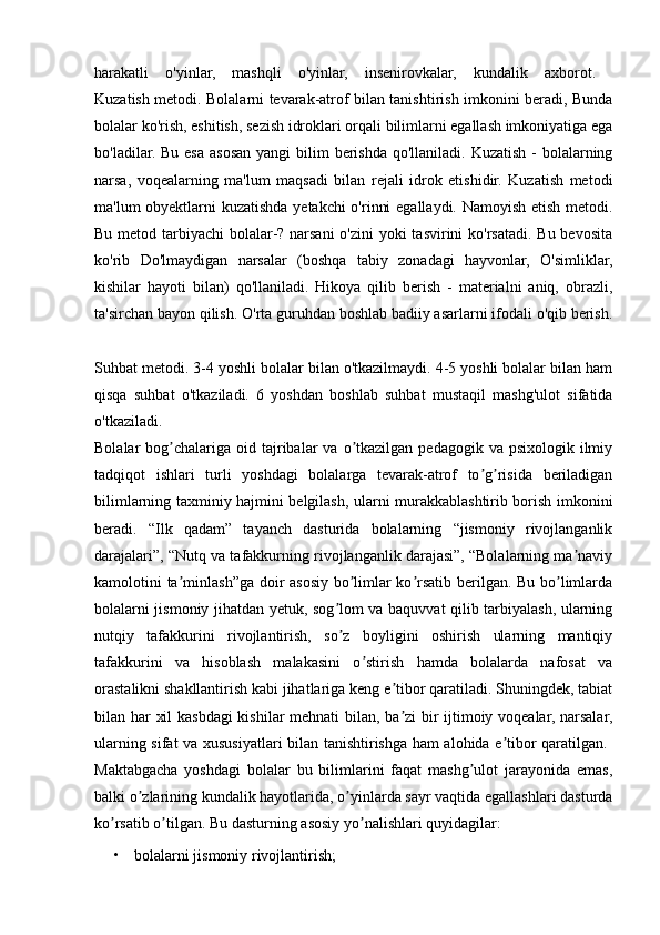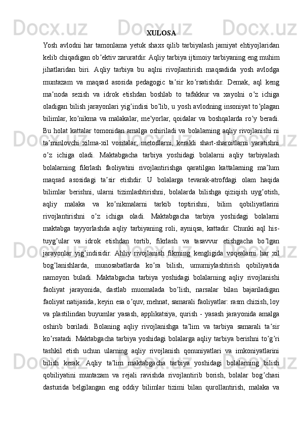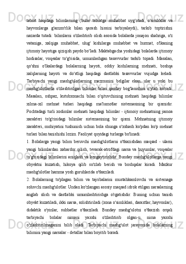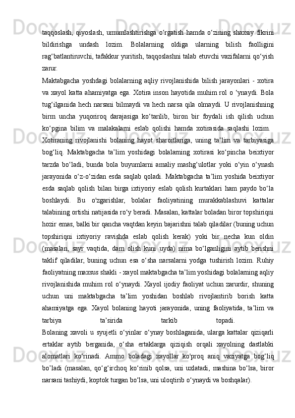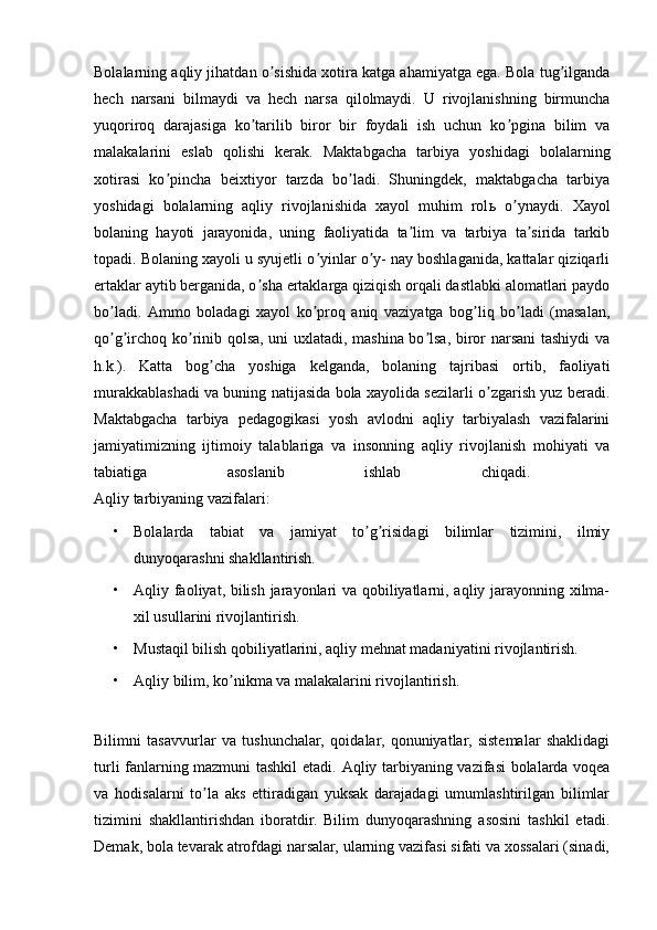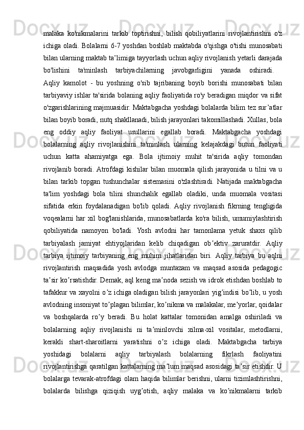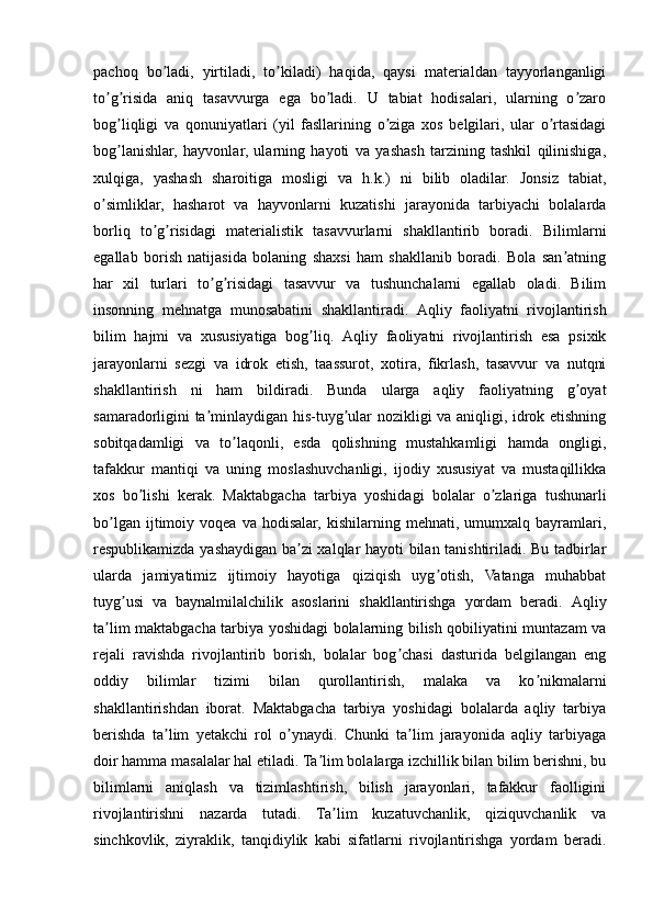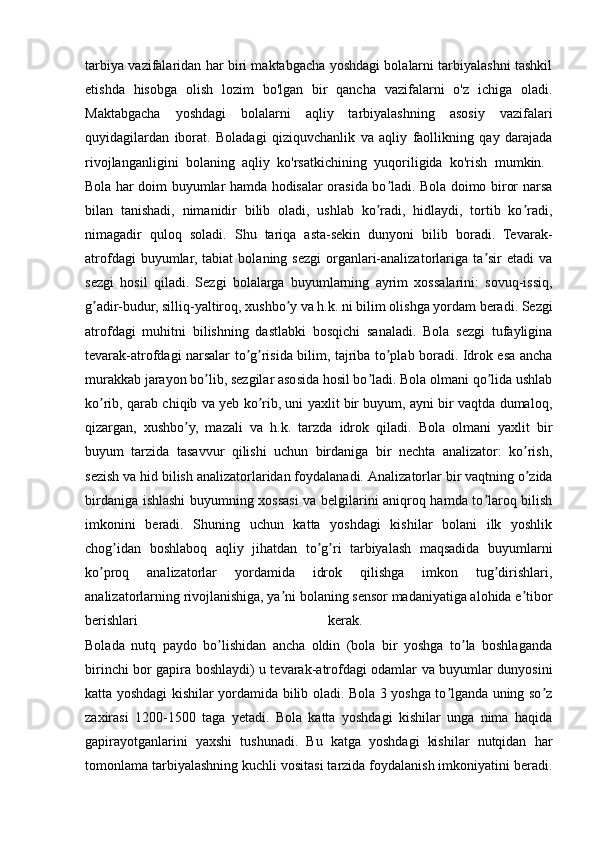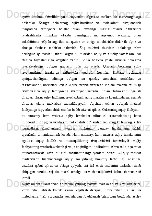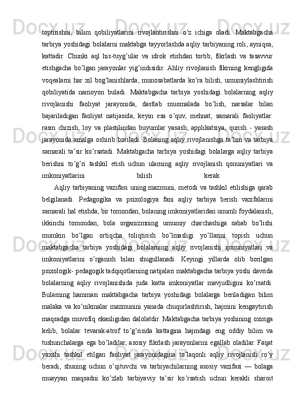 Maktabgacha ta'lim tashkilotlari katta yosh guruh bolalarida aqlliy tarbiya berishning mazmun mohiyati