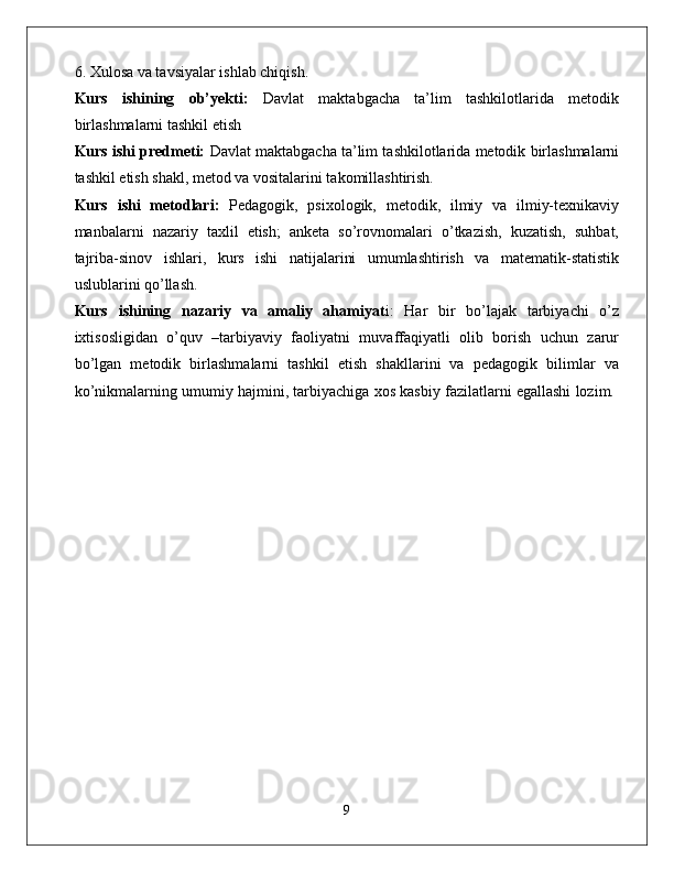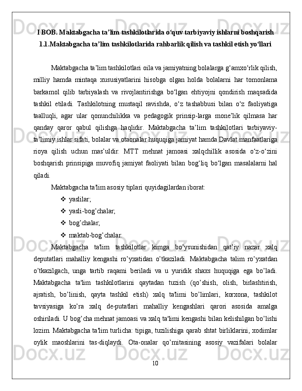 1.1. Maktabgacha taʼlim tashkilotlarida rahbarlik qilish va tashkil etish yoʻllari.................................................................................................................10