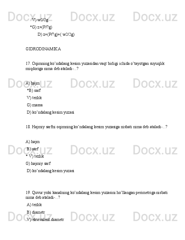 19. Quvur yoki kаnаlning ko’ndаlаng kеsim yuzаsini ho’llаngаn pеrimеtrigа nisbаti nimа dеb аtаlаdi-...?
