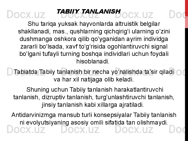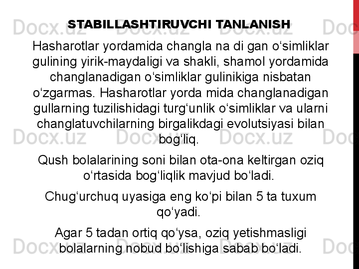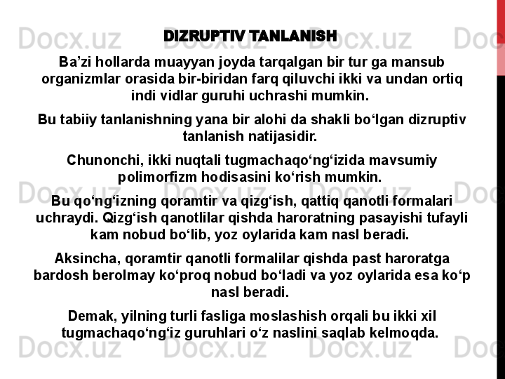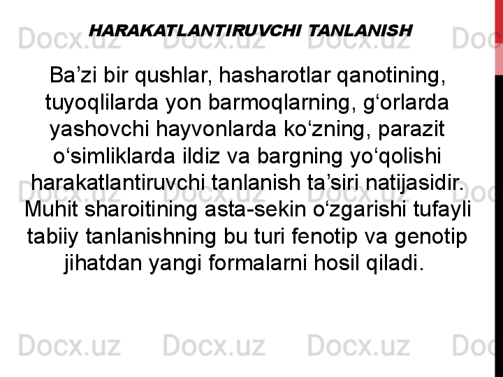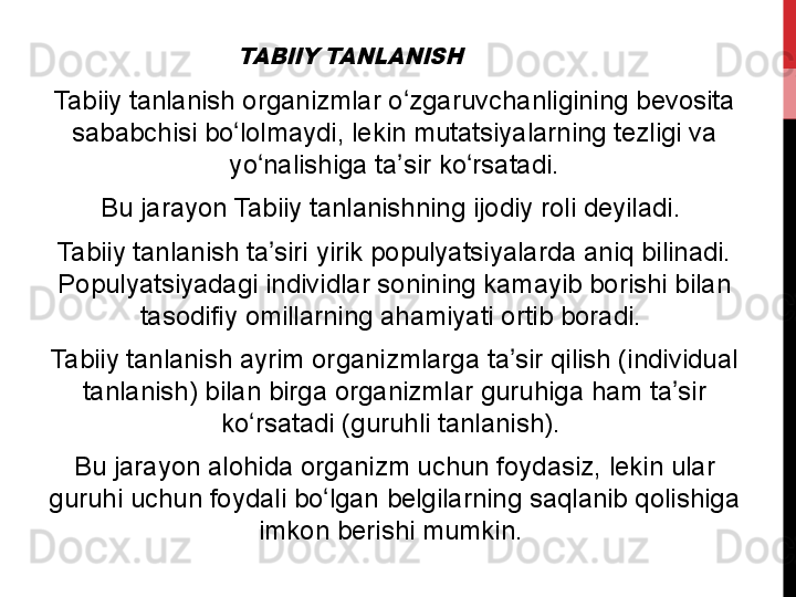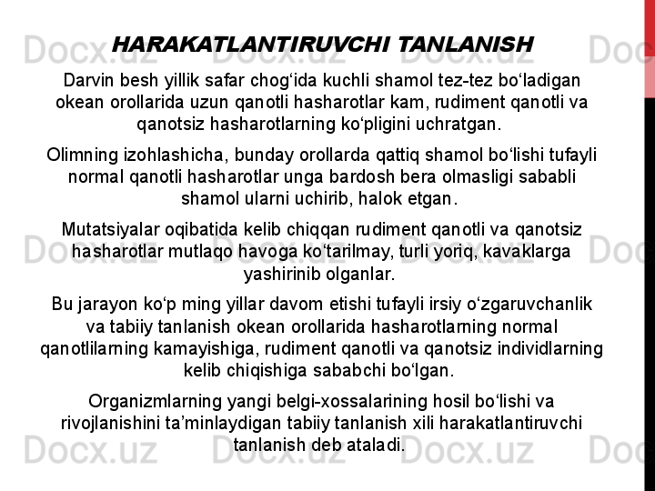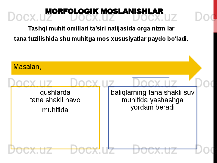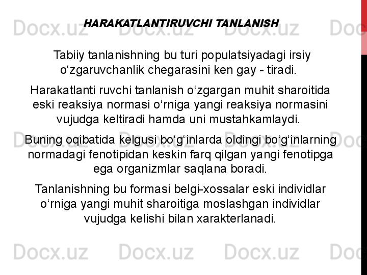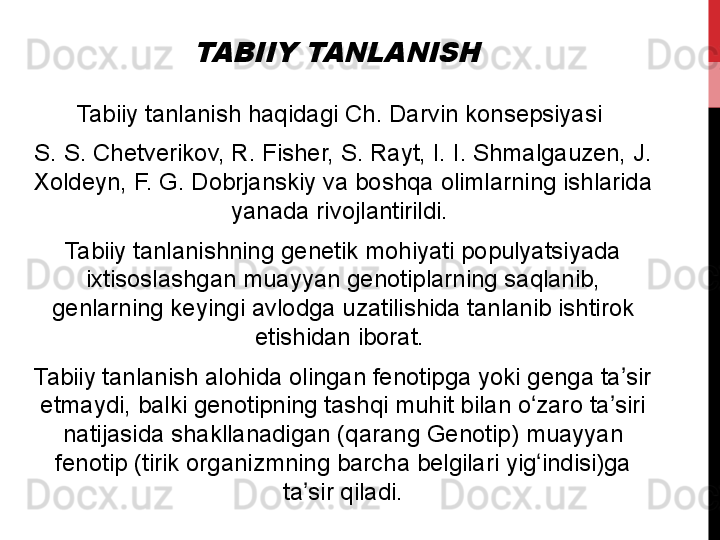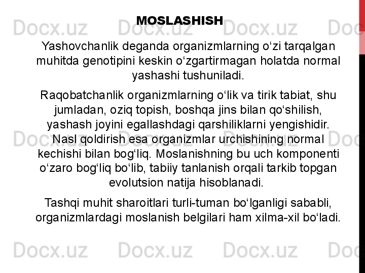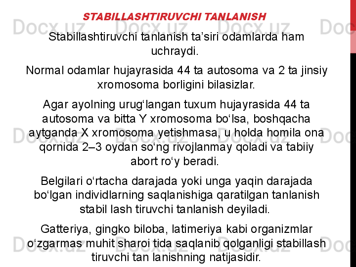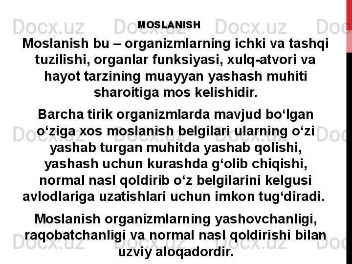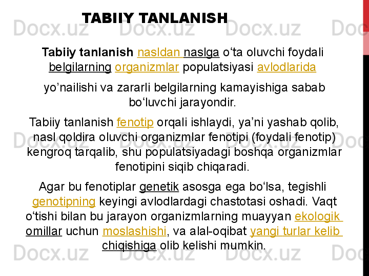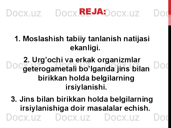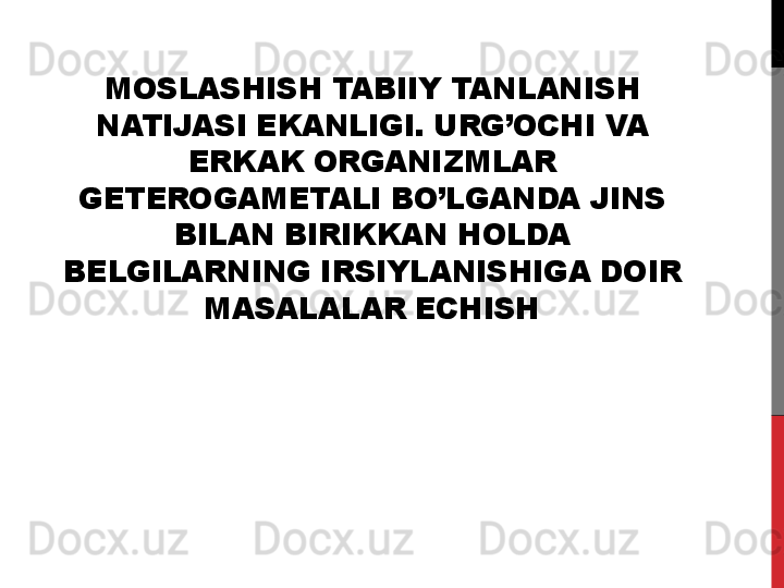 Moslashish tabiiy tanlanish natijasi ekanligi. Urg’ochi va erkak organizmlar geterogametali bo’lganda jins bilan birikkan holda belgilarning irsiylanishiga doir masalalar echish