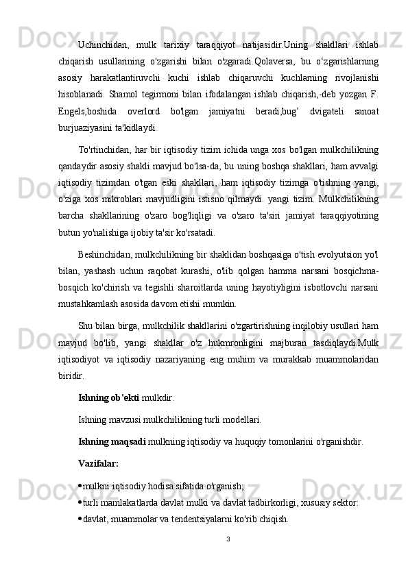 Uchinchidan,   mulk   tarixiy   taraqqiyot   natijasidir.Uning   shakllari   ishlab