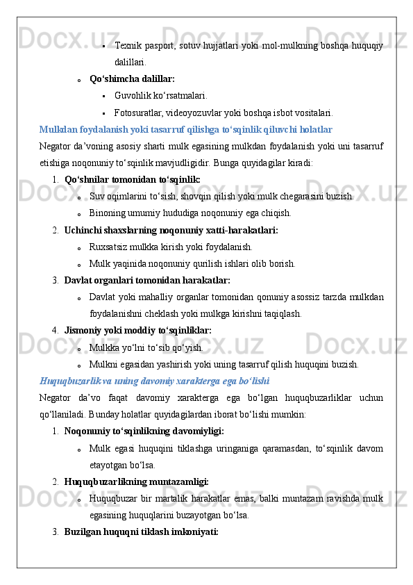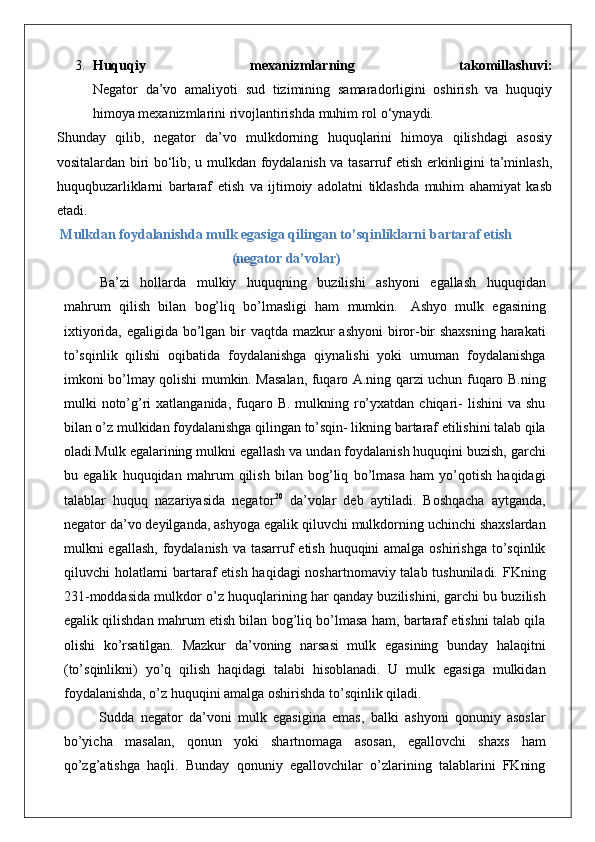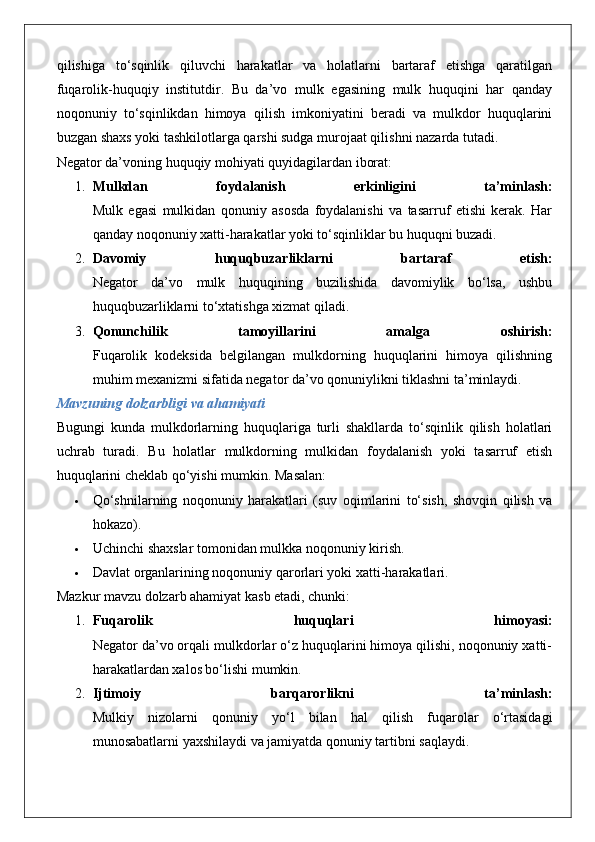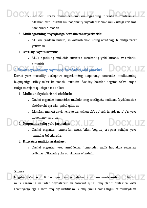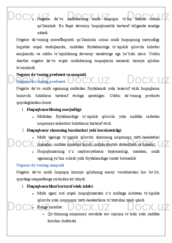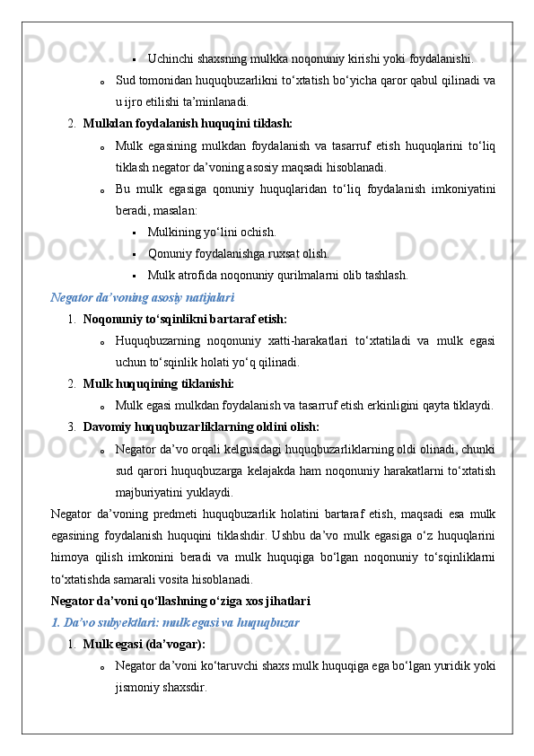 Mulkdorning huquqlarini egalik qilishdan mahrum etish bilan bog‘liq bo‘lmagan huquqbuzarliklardan himoya qilish (negator da’vo).