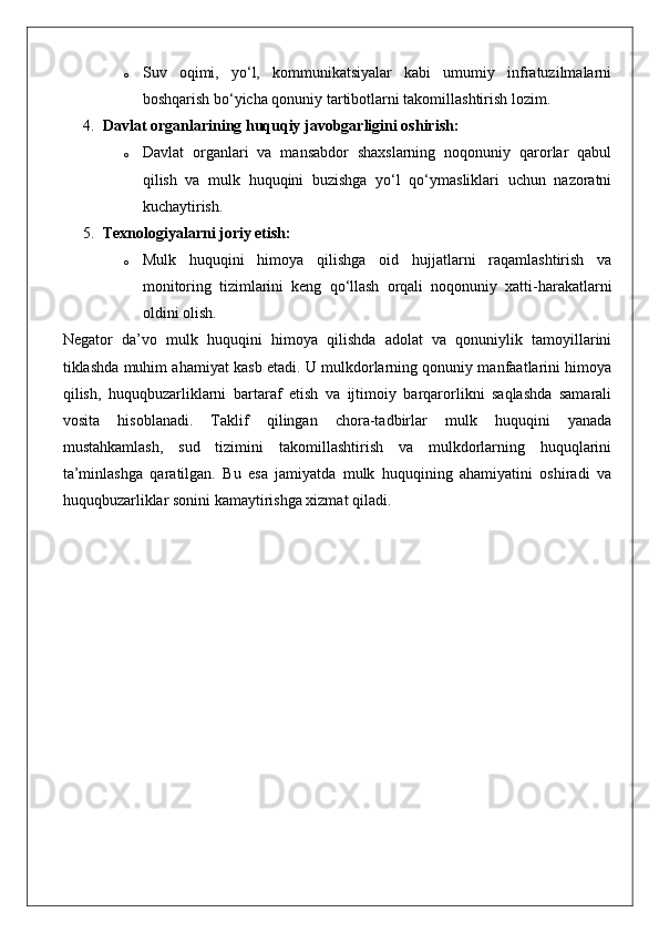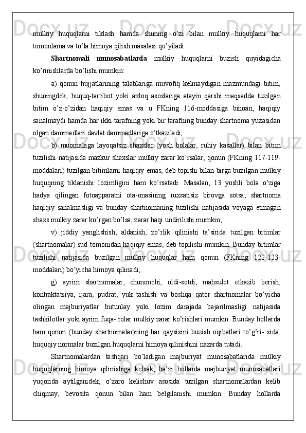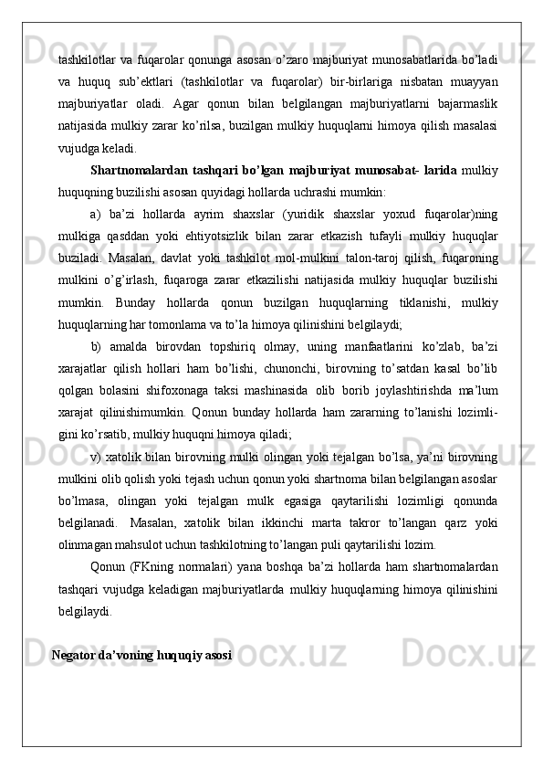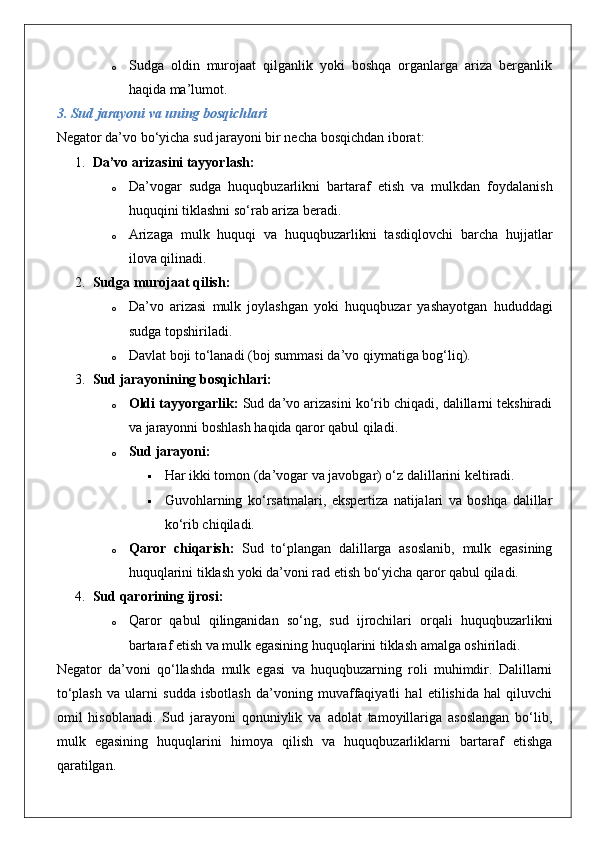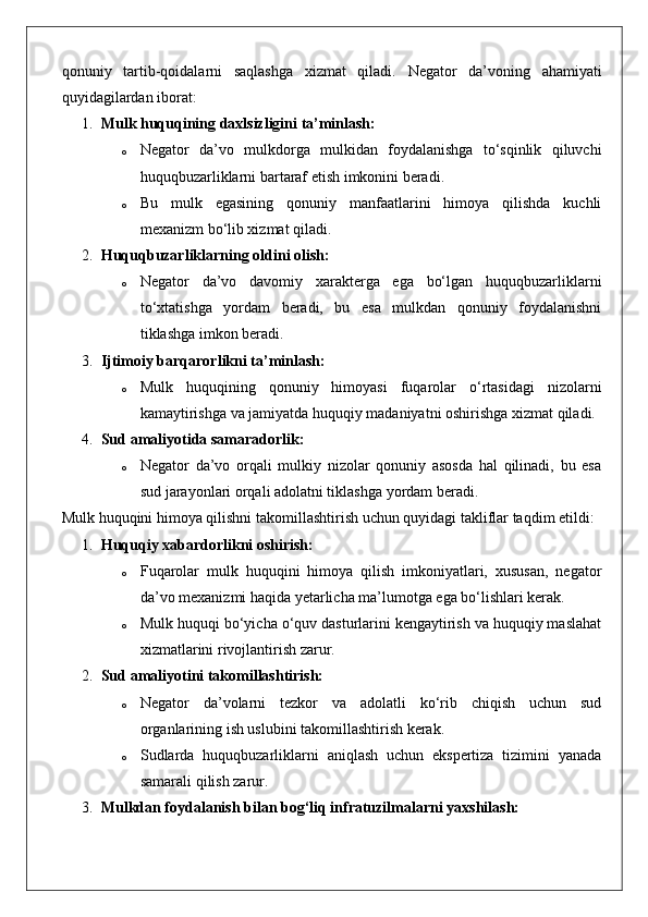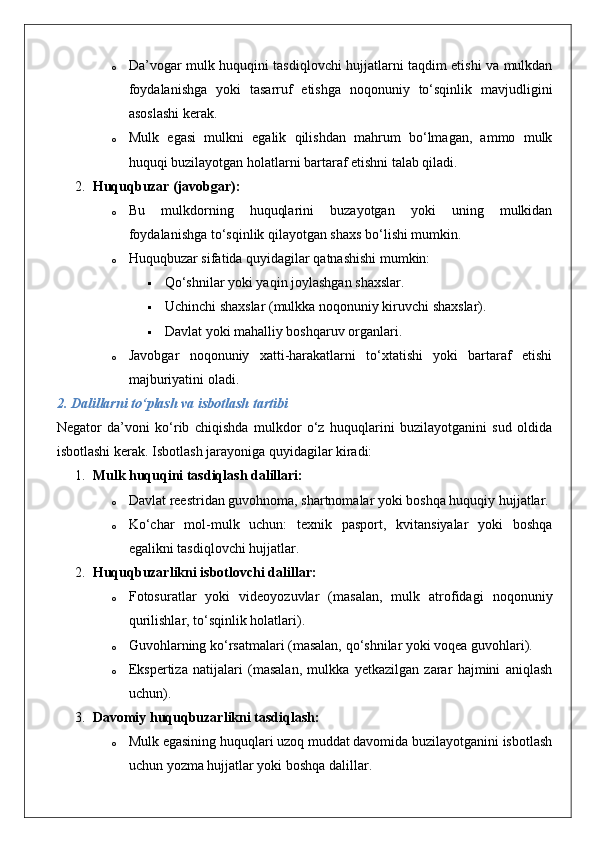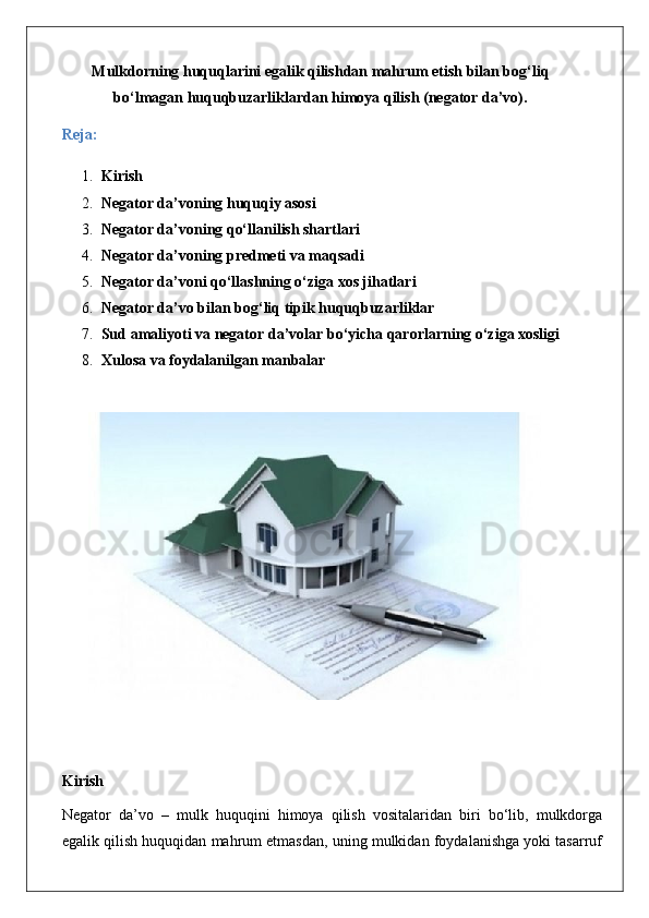 Mulkdorning huquqlarini egalik qilishdan mahrum etish bilan bog‘liq bo‘lmagan huquqbuzarliklardan himoya qilish (negator da’vo).